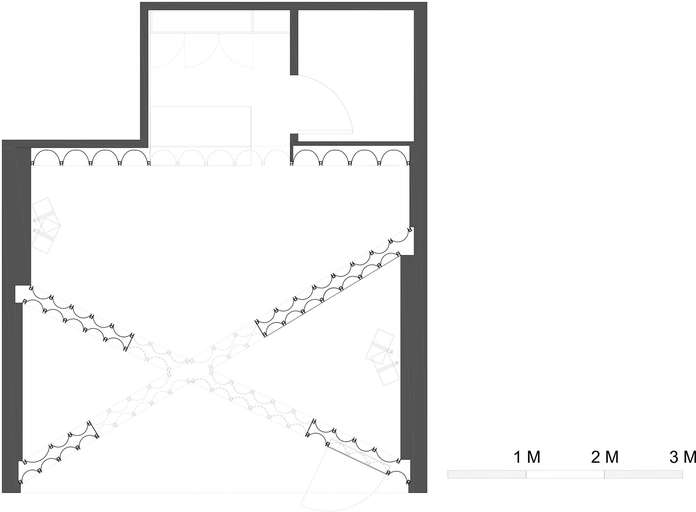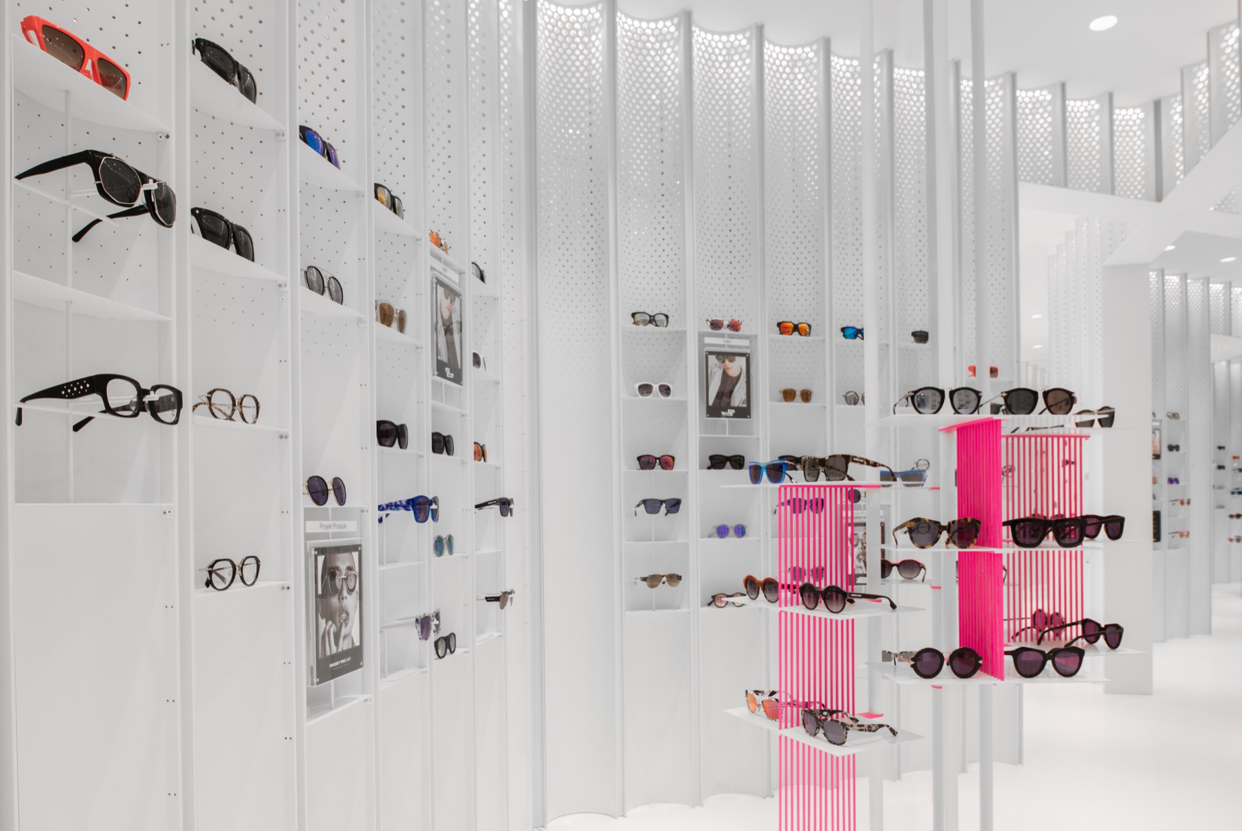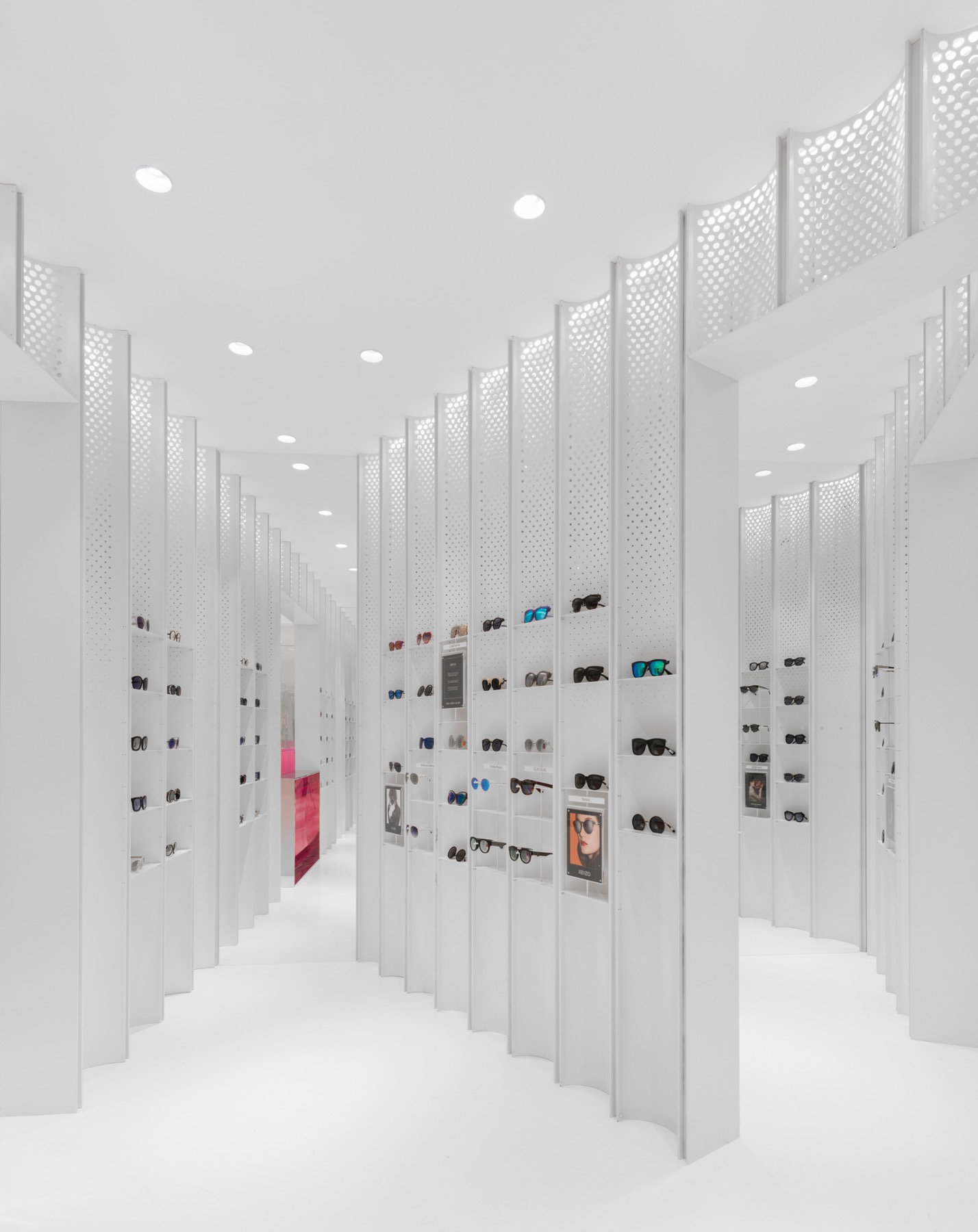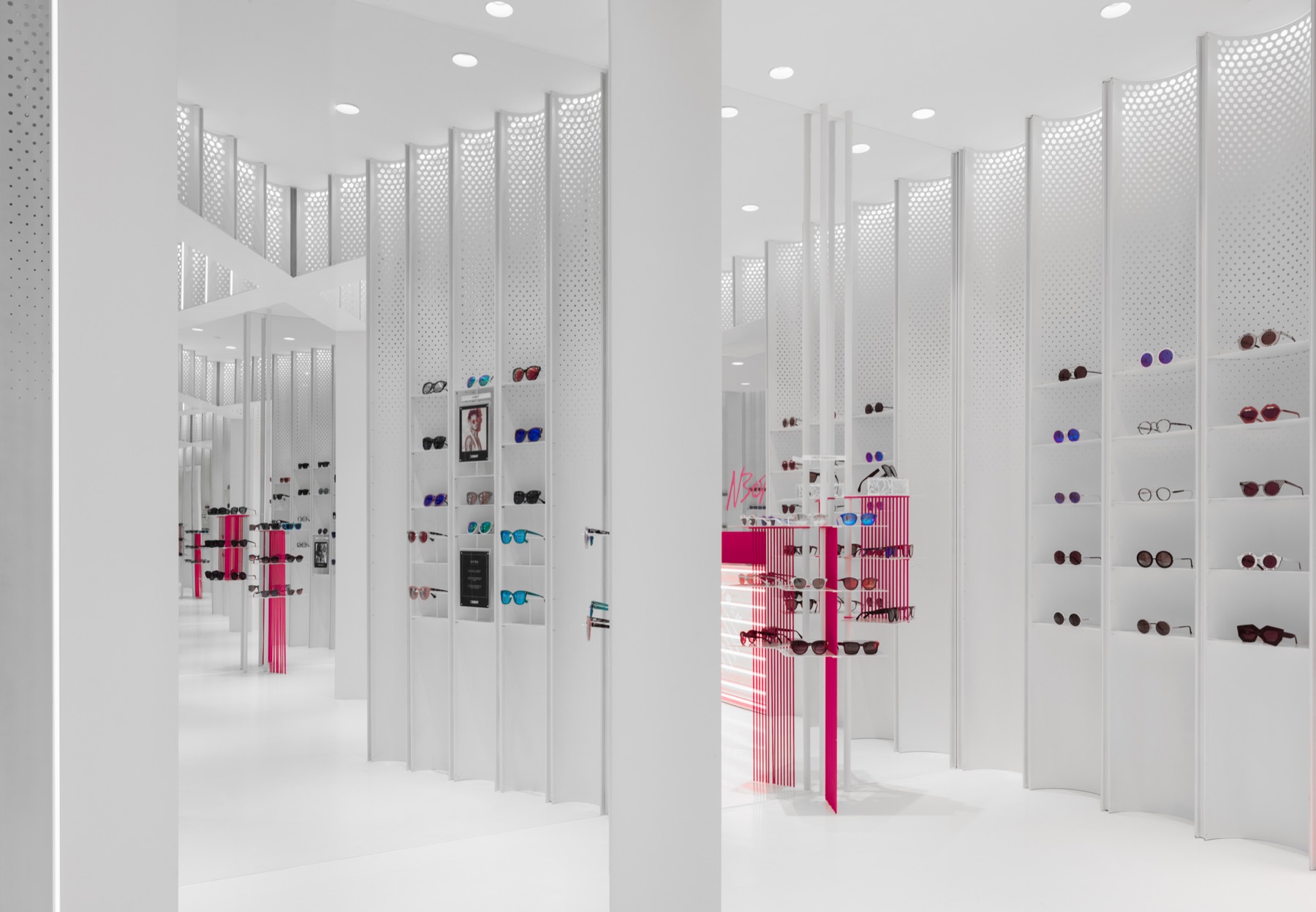 空间的焦点是收银台,这个收银台由一系列荧光灯泡组成,这些灯都是用激光切割的热粉色丙烯酸树脂制成的。镜子沿着凹面的侧壁排列,形成了一个无限的反射场。设计师在凹面板上设置了一系列可调节的固定装置,作为眼镜的展示装置。它们或被陈列在白色金属架子上,悬挂在白色金属棒上,或被包裹在玻璃盒子里,看似漂浮在凹面内。