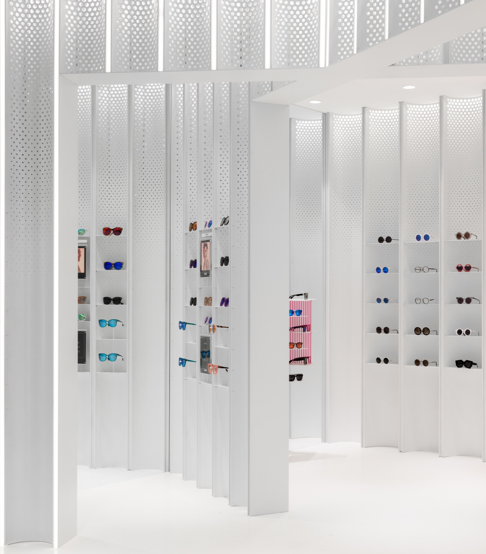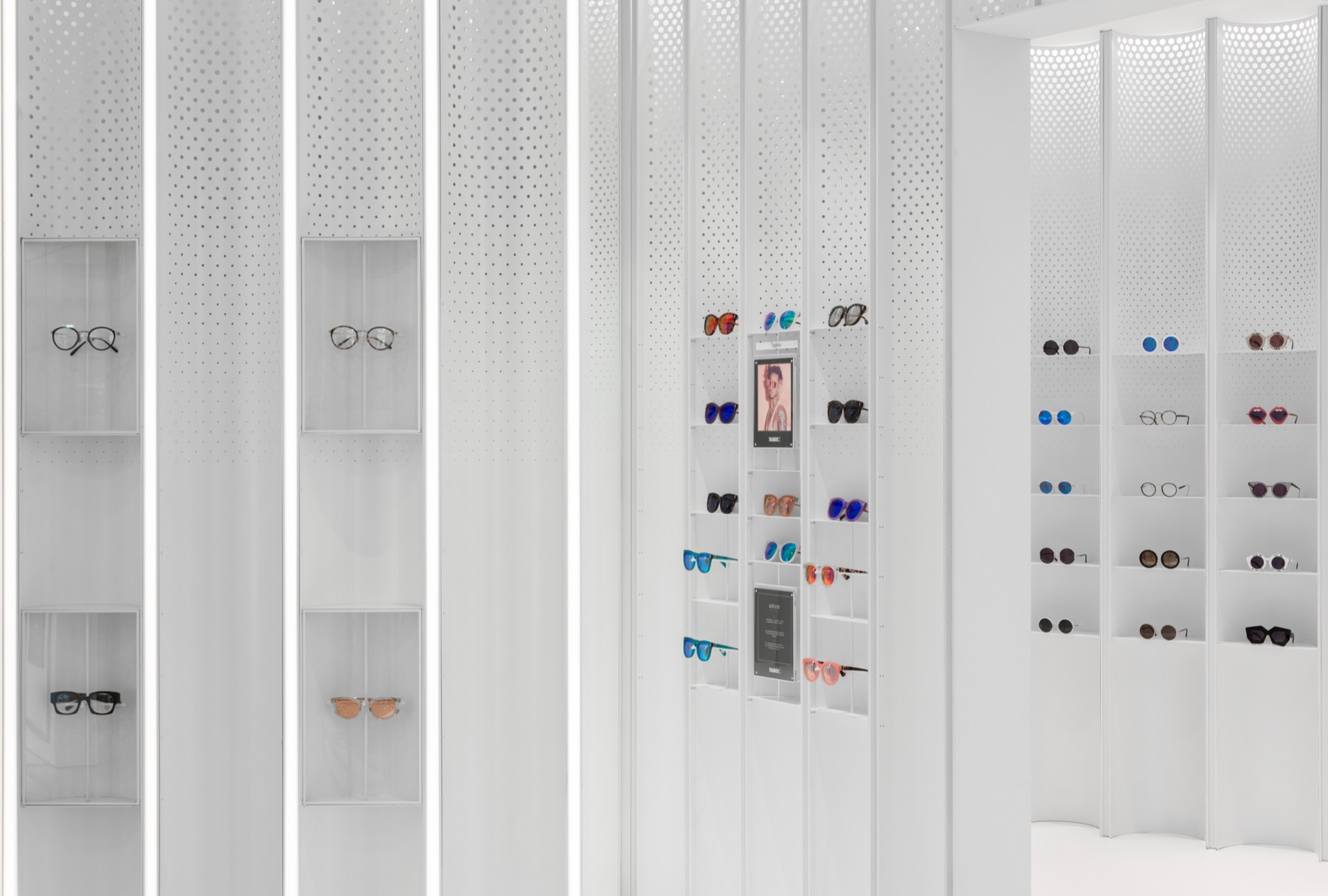 N3ON是一家精品太阳眼镜店,提供了独特的零售空间体验。其空间的概念是受视觉感知和视觉感知的启发而设计的。Linehouse研究了凹和凸、景深和透视的概念。在空间中插入了一系列双面凹孔的白色金属板,通过不同角度的摆放,制造出强行透视效果。