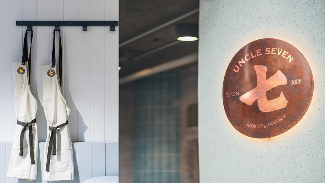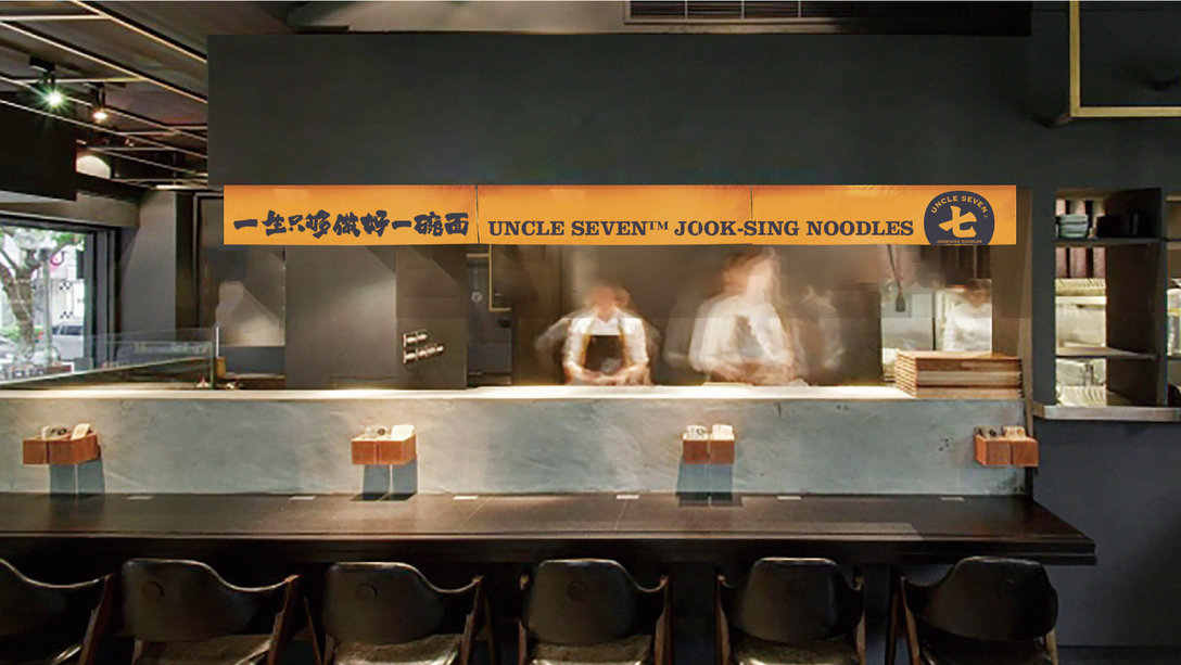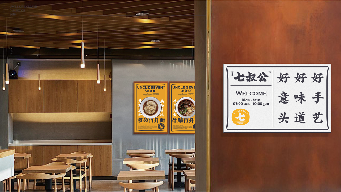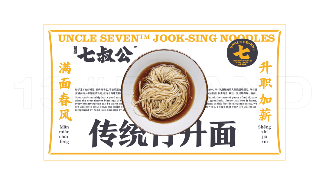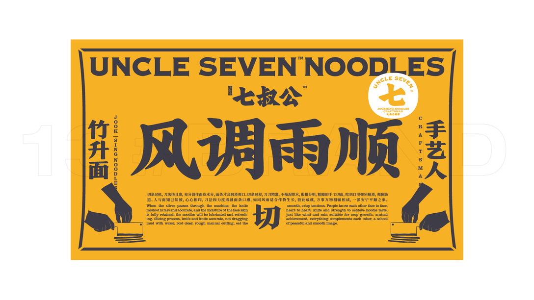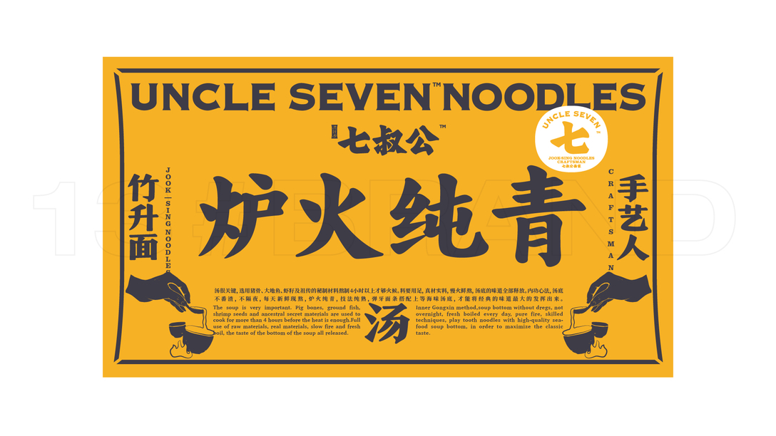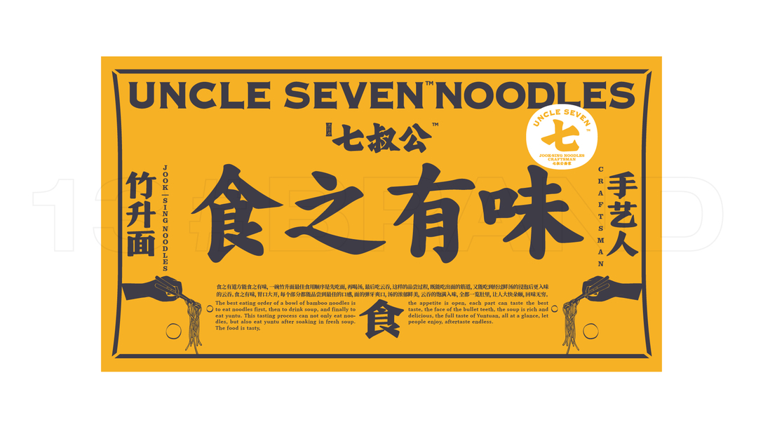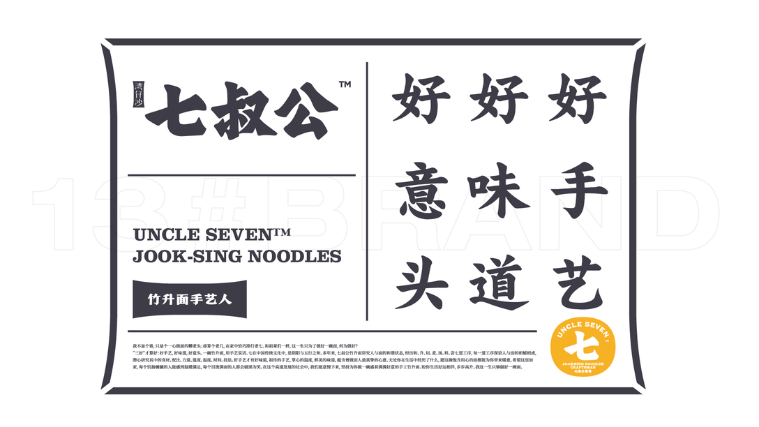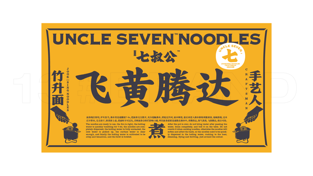 品牌设计公司洞察到目前竹升面市场品牌意识尚未觉醒,大多停留在街头巷尾的家族经营模式,全靠老一辈的手艺人撑着一个店。基于此现状,VI设计公司为七叔公面家量身打造了从品类、产品、空间到选址的品牌坐标系,并明确了这四个维度的关系。从七叔公品牌主张的产品主义出发,提炼“七”作为品牌字号,并将手工竹升面的制作工艺分为七个步骤来照应主旨。