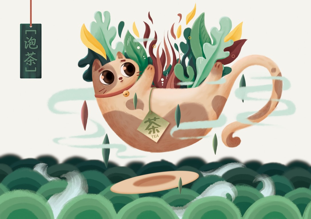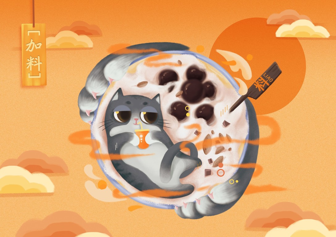 三种不同形态的猫搭配对应的奶茶元素 画面丰富饱满