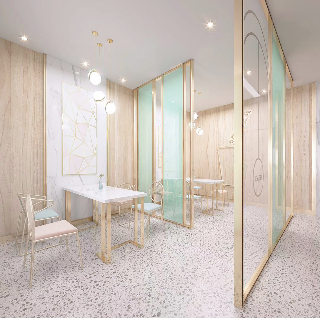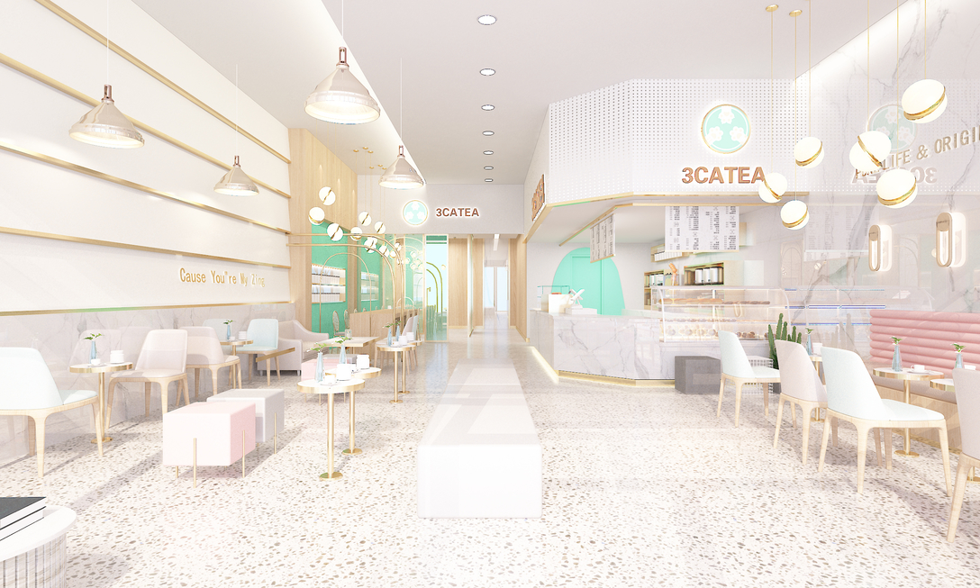 店面整体以白色搭配粉色和蒂芙尼蓝为主 配以小而精的灯具与桌椅