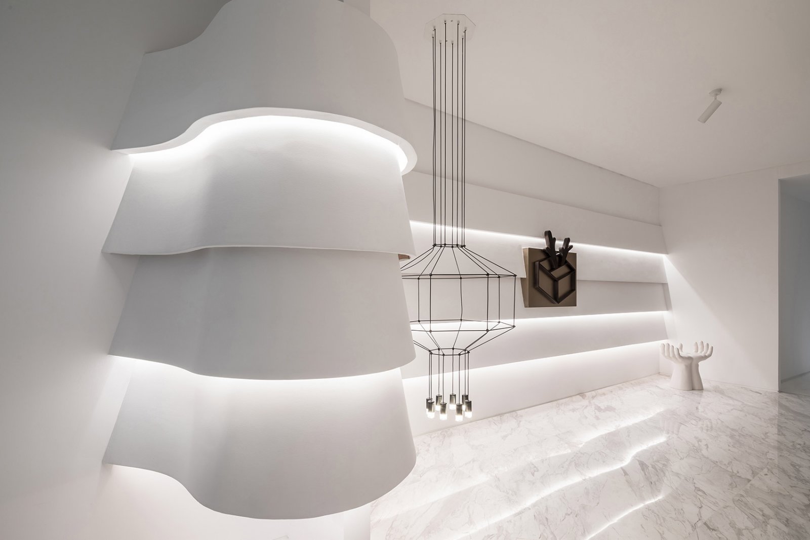 第一映入眼帘的便是概念区,摆放着艺术吊灯与艺术装置,代表着主人对于设计与艺术的热爱。从裙摆的褶皱感抽象出一块立体墙面,呈现在空间中,设计的定义变得更加广泛,整个空间顿时散发出一种和谐的魅力。这便是概念区想要呈现给人们的视觉效果,巧妙地传达了这间办公空间功能性与实用性的设计语言。