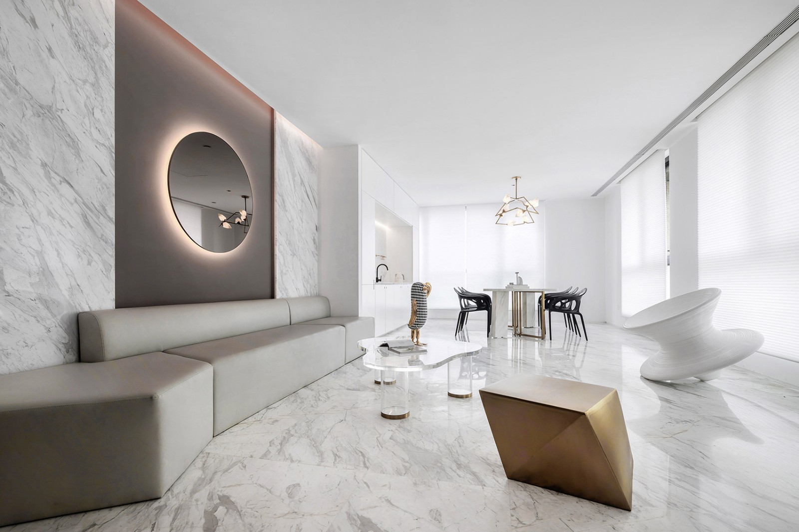 走到接待区,契合墙面的几何形沙发,透明茶几,金属色的座椅,与圆形镜面搭配,仿佛是一轮圆月散发出光芒,空间与每件物品进行了一场有趣的对话。