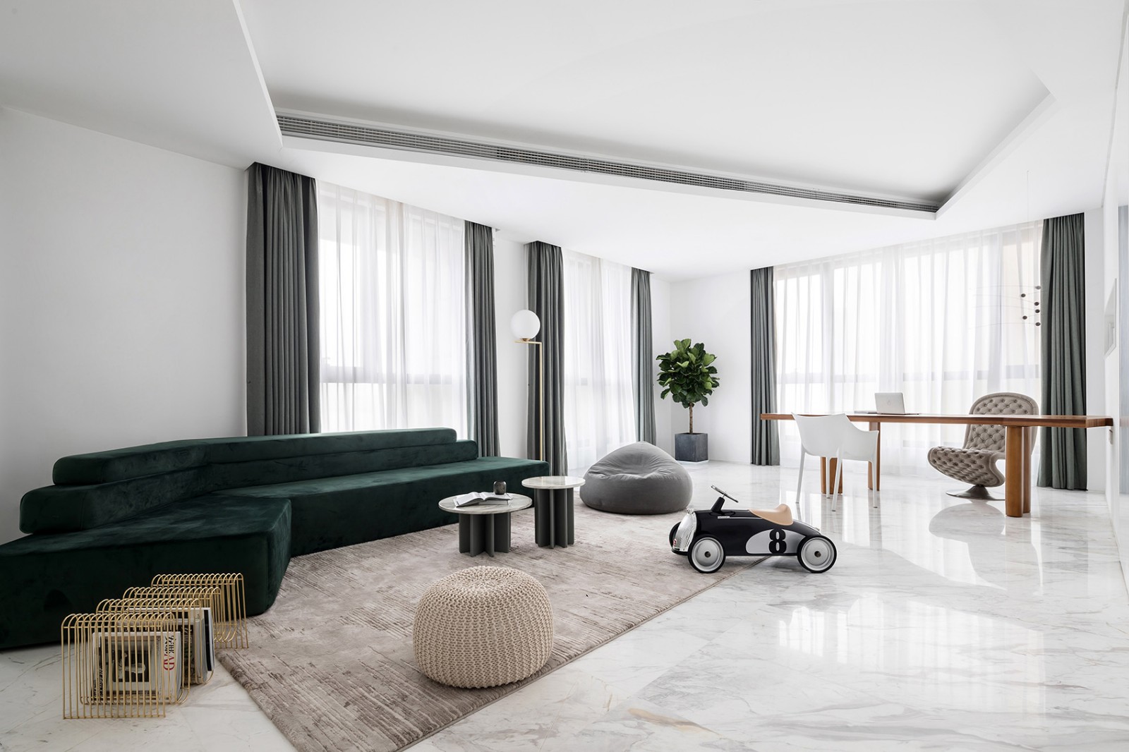 设计师根据两位主人的喜好而量身打造,一间摆放着绿色的设计师款沙发、几何形大理石茶几、实木的办公桌,另一间则摆放着手办以及摄影作品,让办公随时能够充满灵感。
