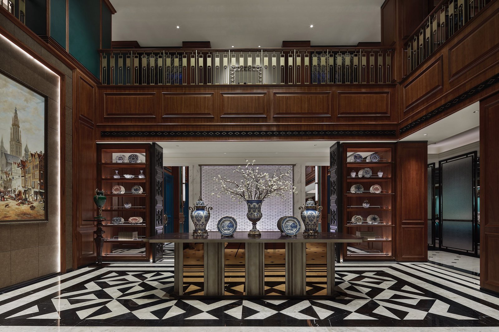 今天分享的案例是一座两层的空间,空间设计公司把这里设计成一个集接待大厅、会客厅、艺术展厅、VIP包房、厨房、书房、吧台于一体的售楼中心,一个沉浸式体验的“万国博物馆”。