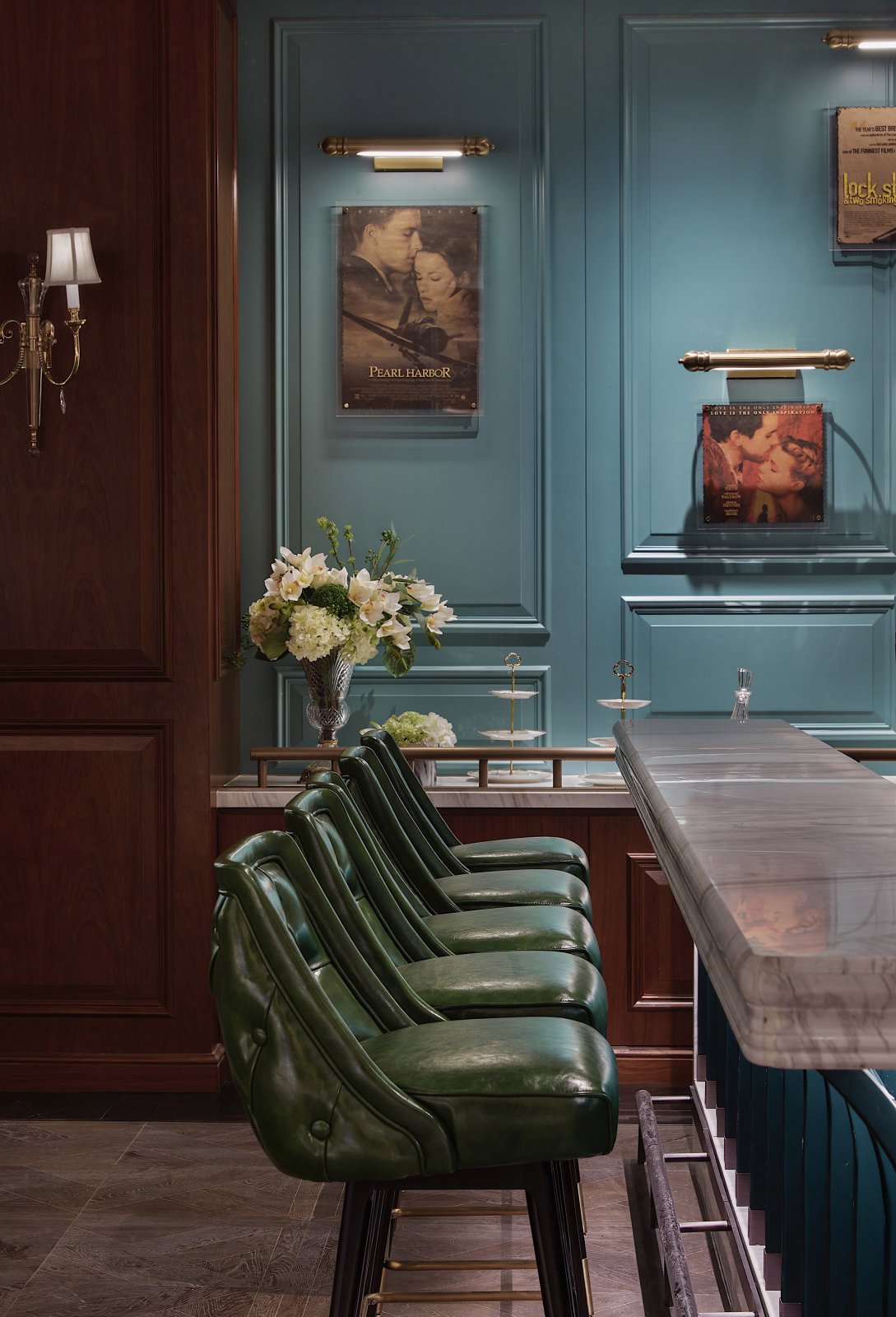 开放水吧选择复古绿色皮质高脚椅,与白色清透的大理石吧台搭配,无比清新,舒展又放松。