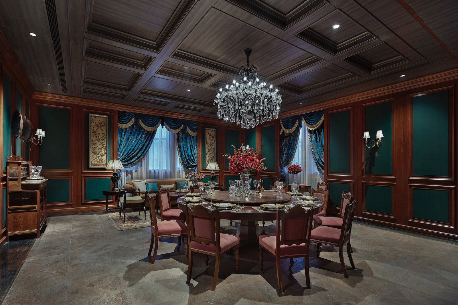 餐厅延续客厅空间的装饰元素,搭配具有西式情节的水晶烛台灯,渲染了餐厅的浪漫氛围。绯红色的花束、深蓝色的窗帘、孔雀绿色的墙,巴洛克式的红绿蓝结合,华丽且强烈。