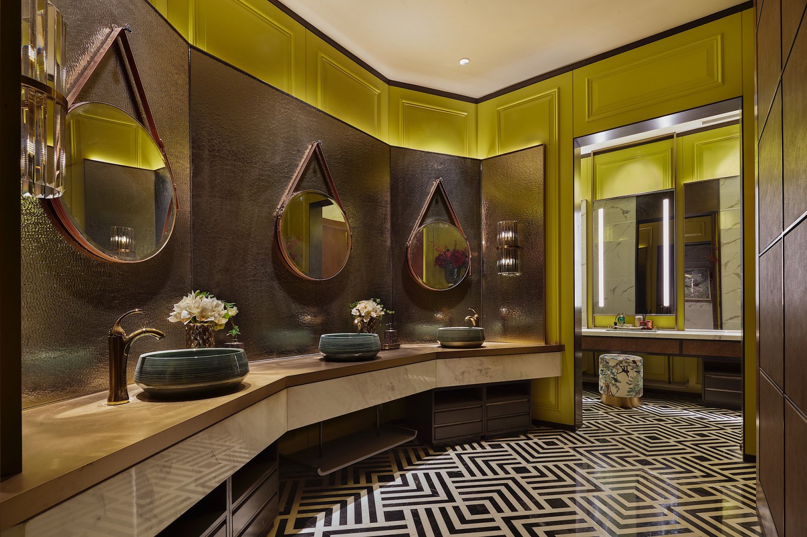 盥洗室的地面沿用了大厅的几何图案风格,墙面主色调采用了铋黄色。为了让颜色更丰富古典,采用了红色皮带作为镜面的装饰,淡蓝色的洗手盆,放置几束艳丽的鲜花,宛如一幅油画在眼前。