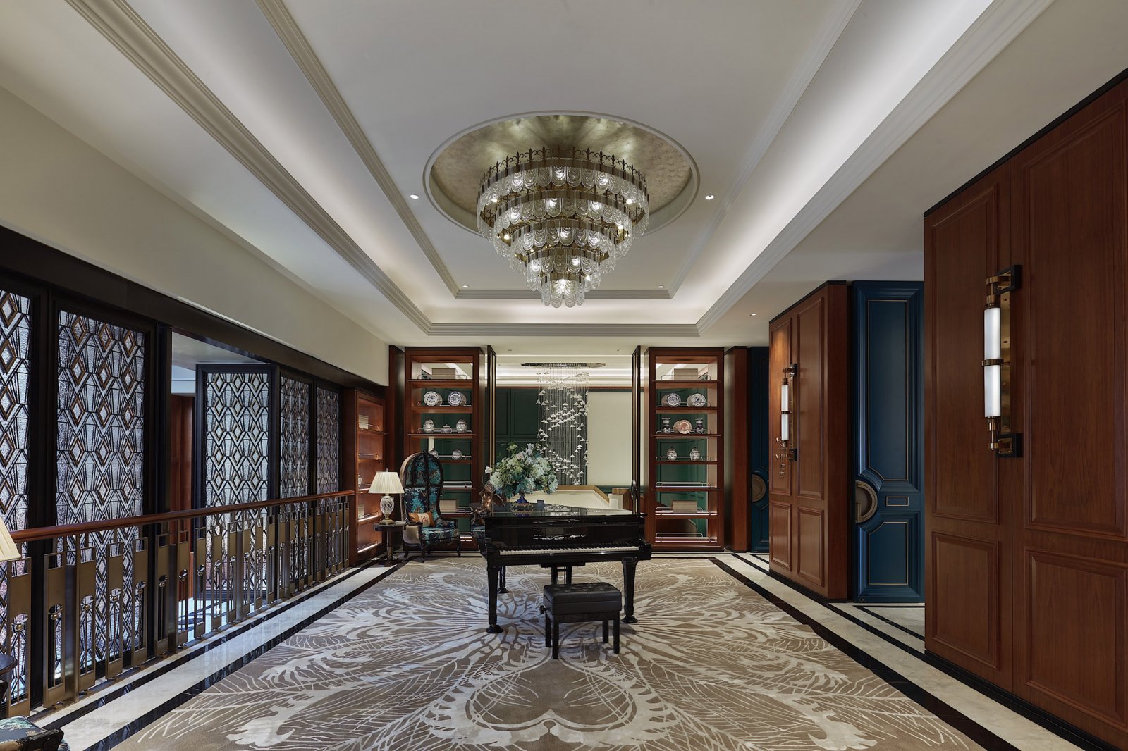 一台黑色的钢琴安静地陈放在二楼的大厅当中,与两个美式高背单人椅一起演绎空间的神秘与文艺之感。湖蓝色的椅身、铜色丘比特雕塑结合清新的白绿色花束,营造了一个优雅静谧的休闲空间。