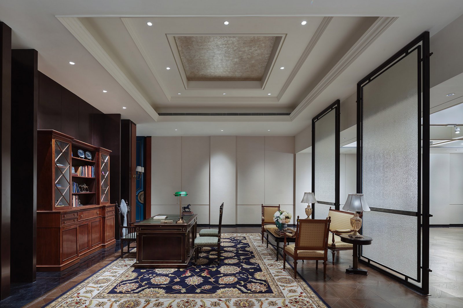在书吧的空间打造上,强调的是舒适及私密,占据一整面墙的书柜、丝绒的高背沙发与美式高背单人椅的碰撞,流露出高级的书卷气息,客户在这个空间可以卸下更多的压力与防备。