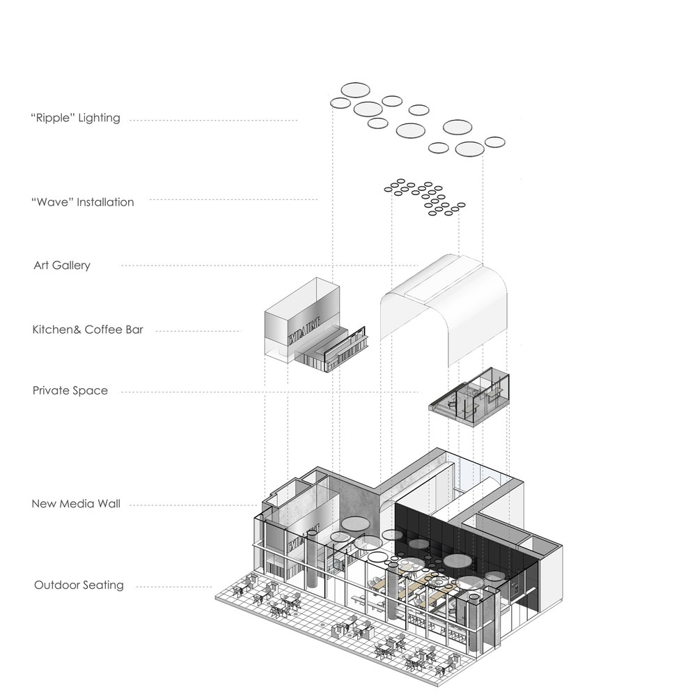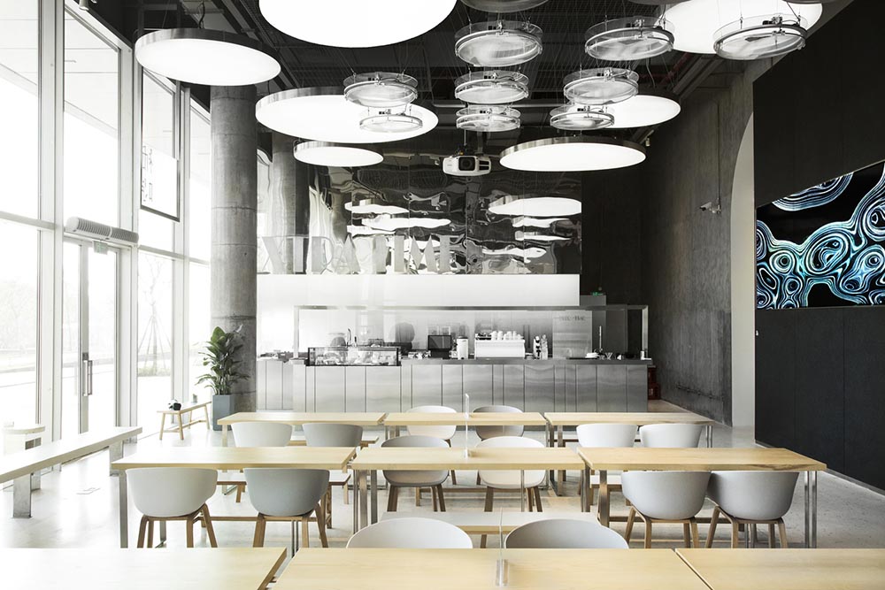 区别于传统咖啡店的听觉体验,在此我们能感受到视觉听觉的双重冲击。时而磅礴时而细密的海浪声,来自于空中悬挂的艺术家作品“海浪”,这是一件通过采集世界各个海域海浪声以钢珠晃动碰撞呈现的新媒体艺术装置,侧墙面则有大型LED屏幕同步播放海域音响。