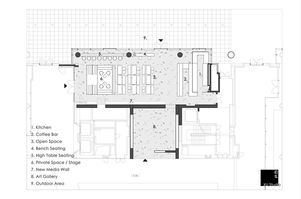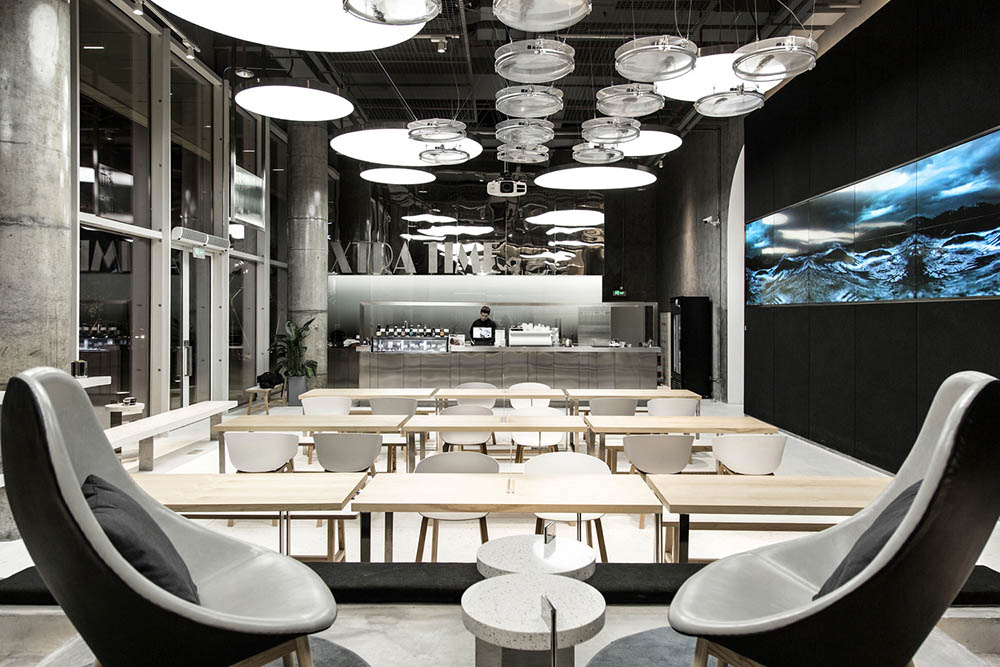 项目平面呈凸字形排布,空间设计公司选择沿户外靠近海岸的长条空间作为咖啡及知识分享区,凸出的方形作为艺术空间,链接海上艺术中心中庭。顾客由建筑中庭进入纯白的艺术空间,户外自然光透过高而窄的弧形门洞指引顾客前往探索,挑高6米的全落地窗大空间跃然眼前。