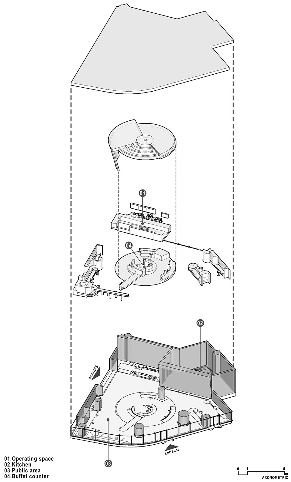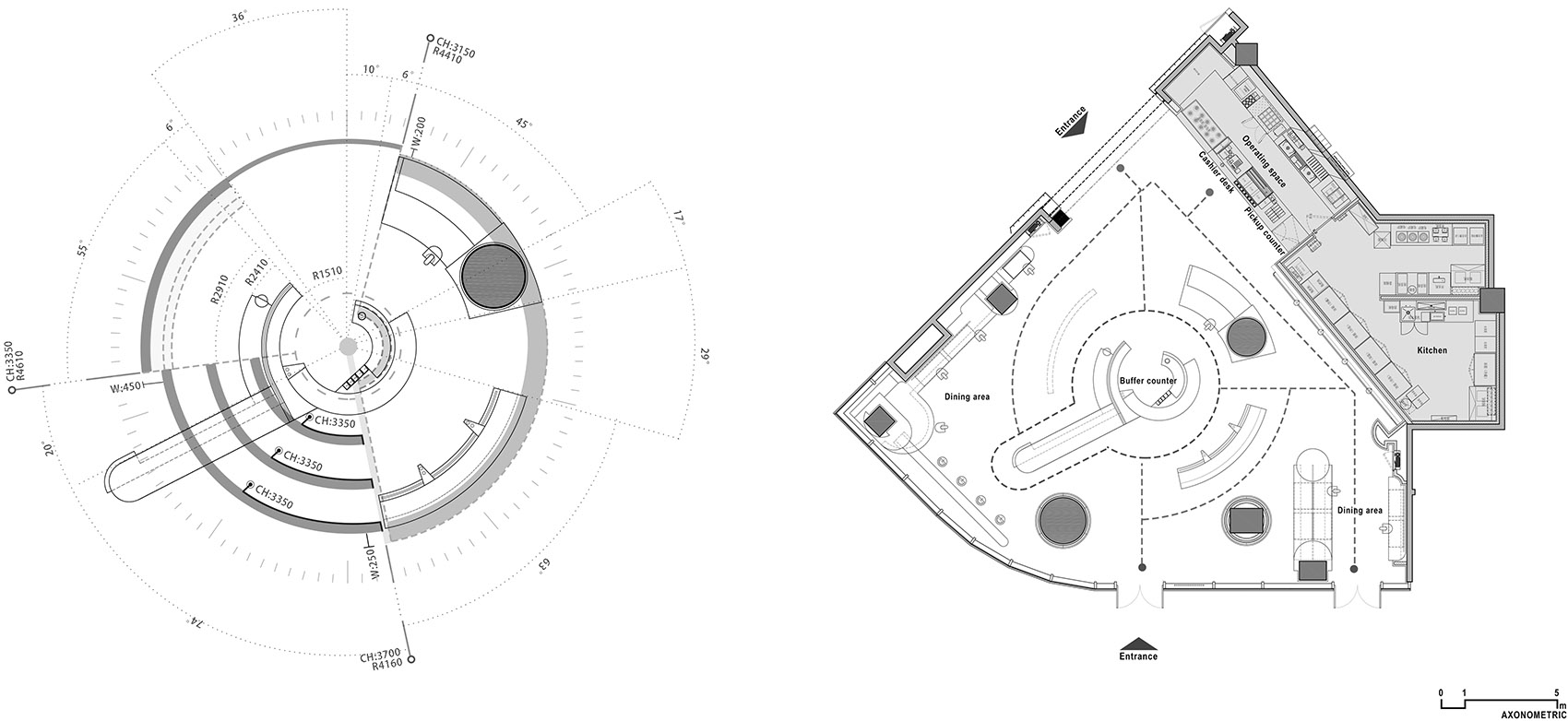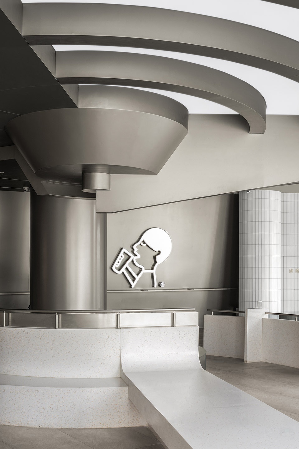 设计的核心集中在局部,一种螺旋扩散的非对称性环形结构。这种结构的植入迫使周边环境重组成各种形态迥异的空间,以丰富的空间体验向人们诠释品牌内核。