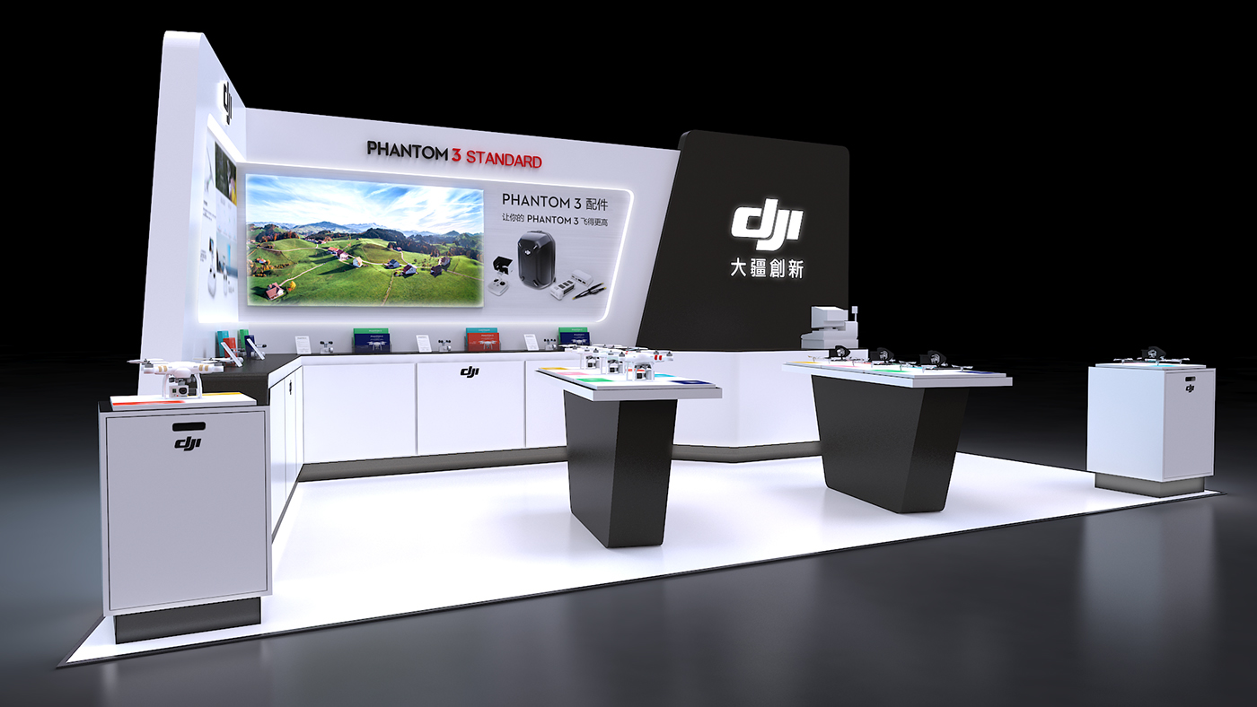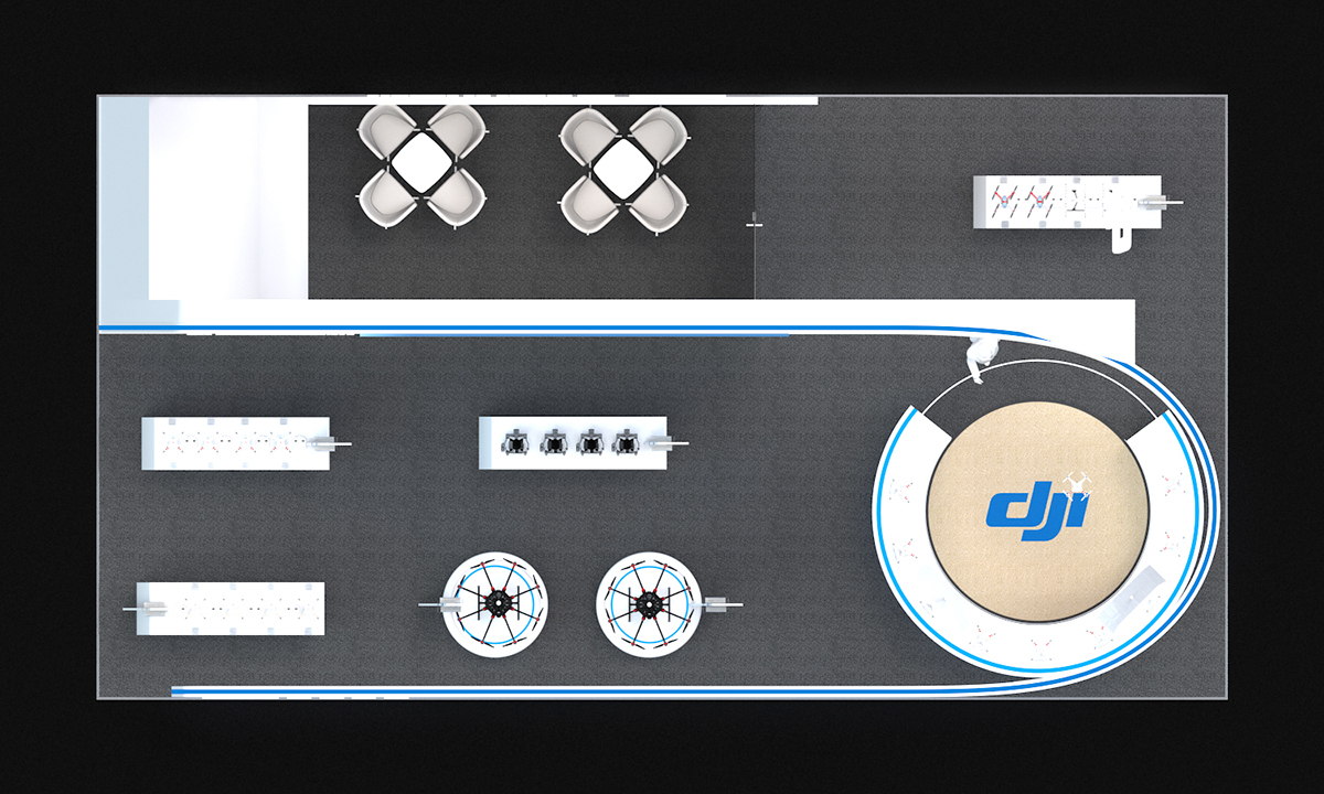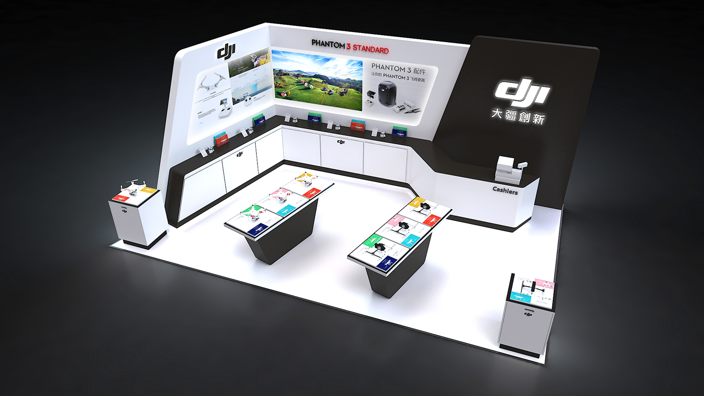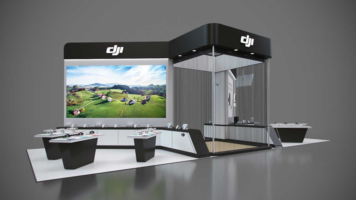 SI设计公司通常会通过店面形态、配色及道具设计来凸显行业属性和品牌理念。大疆无人机专卖店设计整体以黑白灰为主,点缀天蓝色,展现航拍产品的行业属性;道具设计浑厚沉稳,传达无人机的稳定飞行的产品特色。