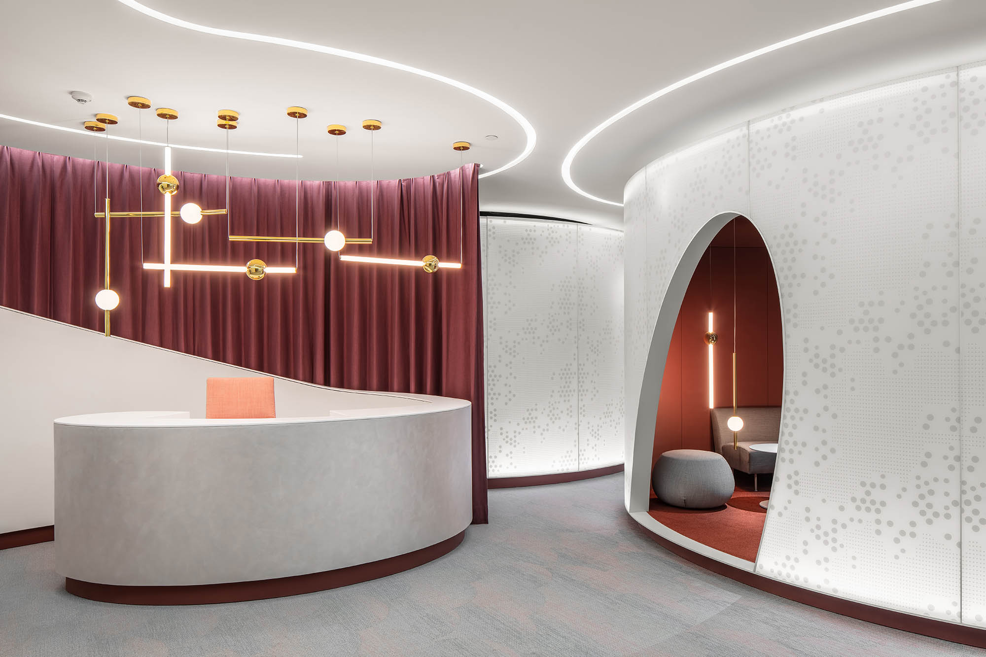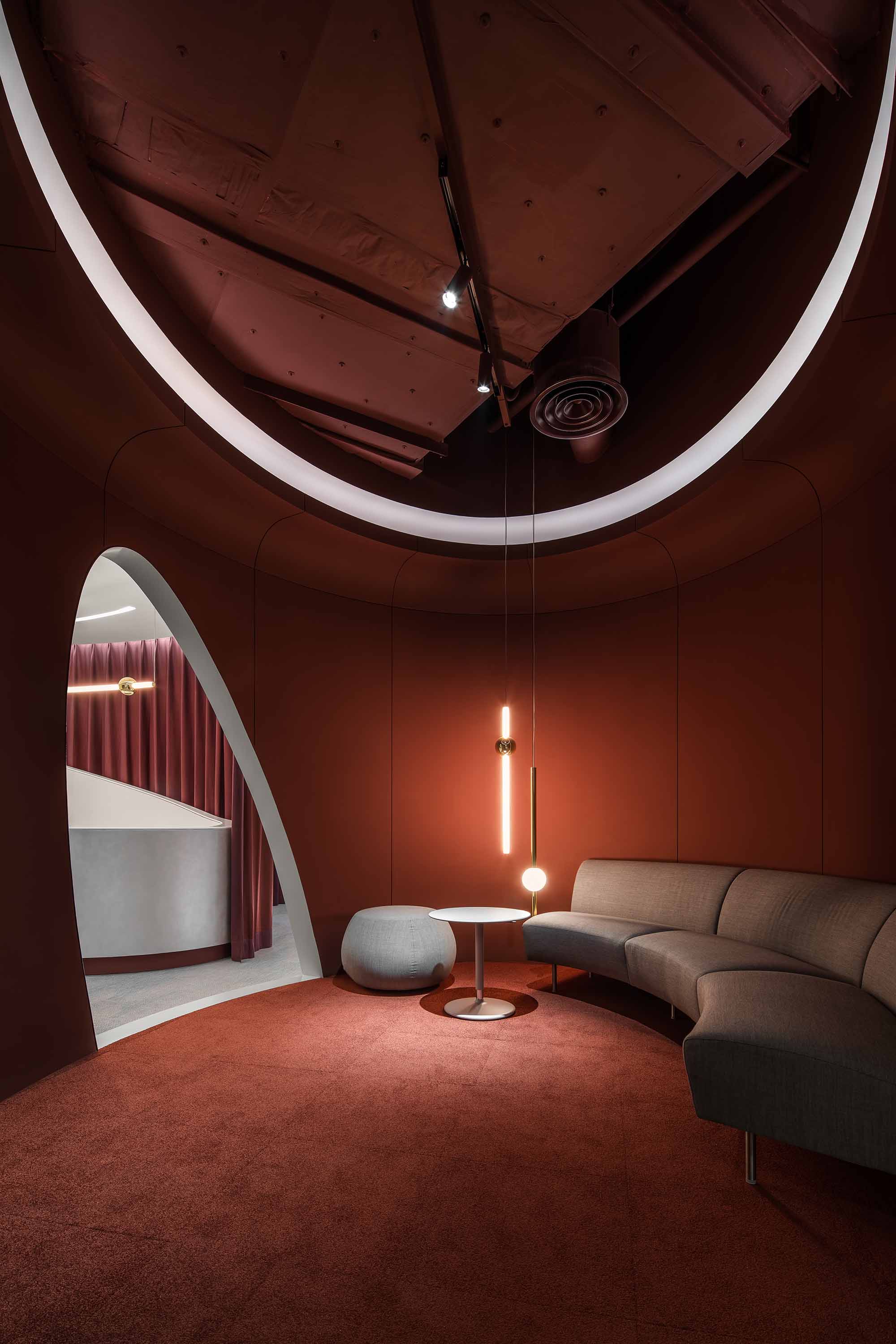 运用造景手法打造的接待台,以螺旋造型和深红色帷幕为场景增加戏剧效果,同时也帮助遮挡了设备间。