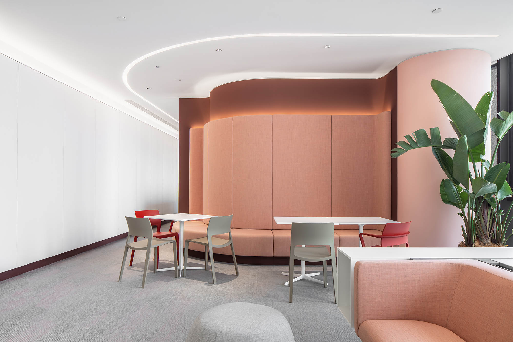 建筑空间是静止的,而人的视觉和心理感受却会随着场景转换而变动。前台区域作为进入办公空间的第一印象,投射出曲线艺术的科技感。以活泼的曲线象征创作思维的无限,为空间增添趣味的同时也丰富了空间的情绪。