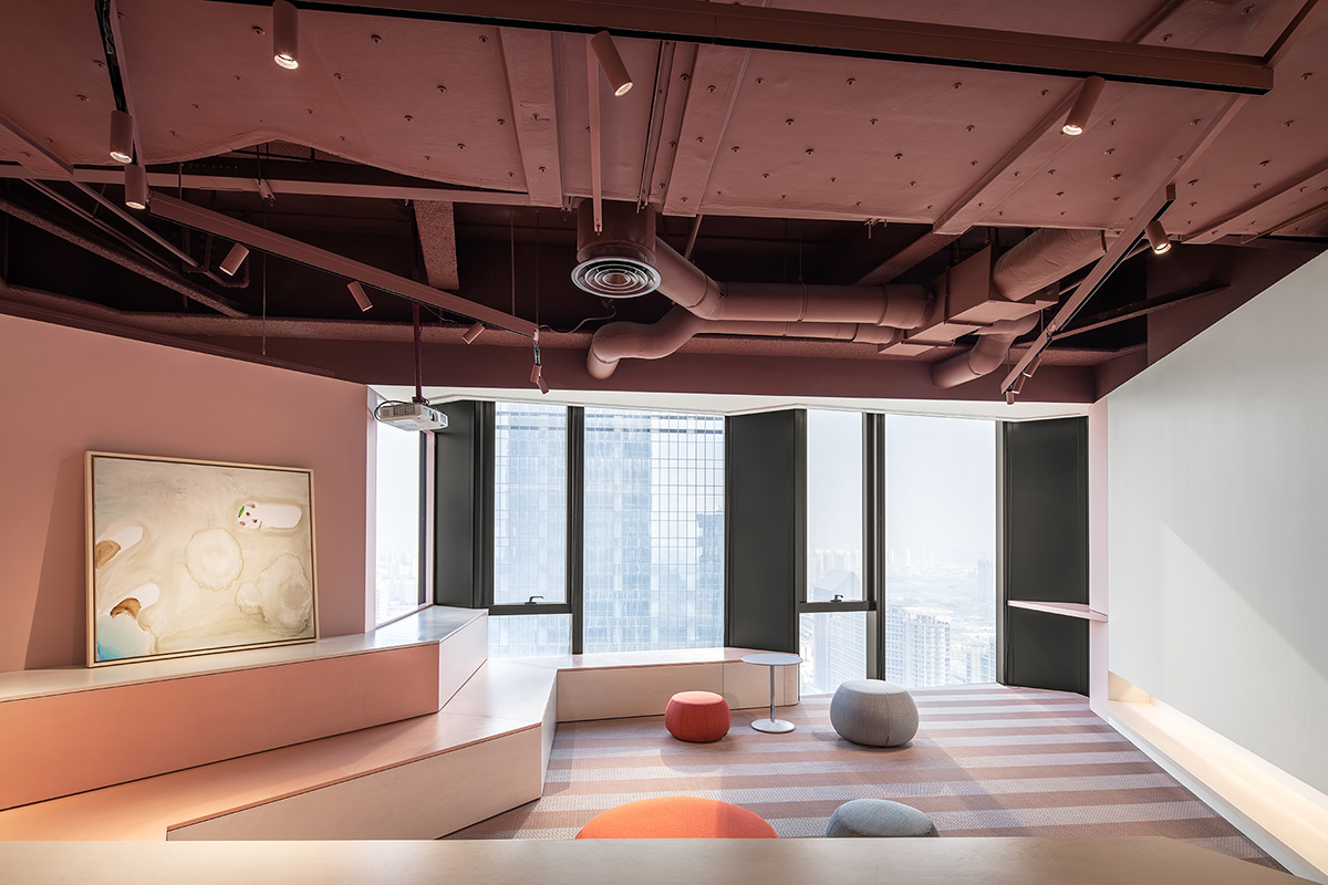 电子商务公司与传统公司不同,对于固定工位需求少,流动性更强。所以SI设计公司抛弃传统的格子间办公设计,让场景既能呈现各自的独立性,又能结合起来形成大的聚集场所 。同时在空间设计中引入柯布西耶的色彩理论,利用“红白粉”三种颜色营造出一个多层次的办公环境。