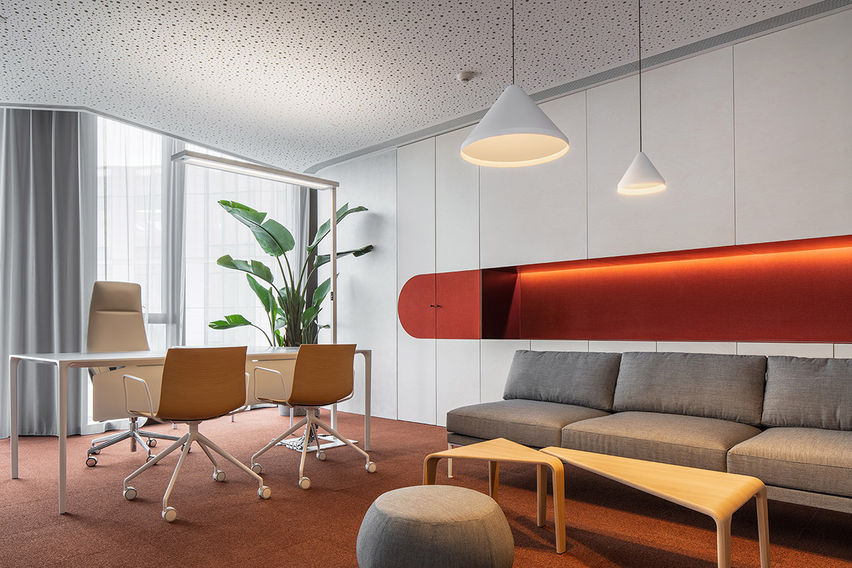位于空间最内部,合伙人办公室成为最隐秘的功能区。采用吸音材料装饰外部墙面,增添艺术感的同时减少声音的传入。内部陈设简洁且艺术的家具、自然气息的绿植,让整体舒适而有质感。