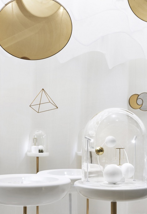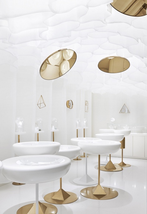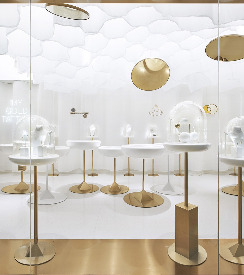 空间通过灯光的配合营造出晴空的明亮氛围,令整个店面充满云层之间或均匀或跳跃洒下日光。这是是讲述故事的空间,也是一座关于金饰的微型美术馆。