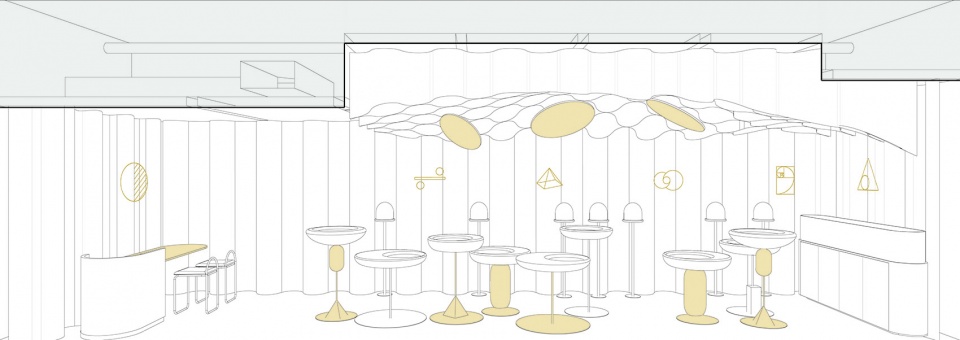 场地空间不大,但展面长,进深小。这样的空间尺度没有制约空间设计公司的想象。以长展面拟作天空,采用柔软肌理的帷幕纱帘,绵延中模糊空间界限。起伏的天花造型能消解原天花上生硬的结构高差。以进口人造石定制的连绵漂浮云朵展台是空间亮点,烘托金色珠宝的温暖韧性。白色展台质感温润,造型柔软,吸引顾客将视线落到产品展示上。金色的底座是洒下的云翳。