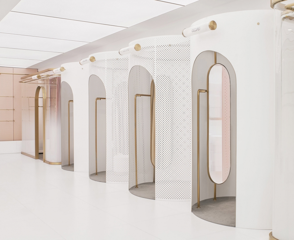 ▼ 位于商店中线上下位置的7个试衣间,顺着店铺的开敞面排成一排,可作为过道使用