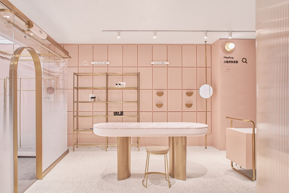为了满足这个特点,我们采用了最具陈列灵活性的洞洞板展示方式。并对当下洞洞板的单调的展示形式进行了改良,使其兼顾美观与实用性。相对应的,挑战也随之而来。洞洞板展示系统对于陈列师的要求很高。如果给传统的店铺设计,我们会有所保留,固化操作流程,简化陈列师搭配的难度。但是在设计的过程中,经过多轮的讨论,包括设计师内部之间和设计与业主方之间的沟通讨论。我们决定,还是要坚持洞洞板的设计。原因是Heyshop不是一家传统的店铺,不能以传统的设计经验来判断。将来的新零售,对店长的要求可能不是线下多卖出去多少货,而很有可能是有良好的陈列搭配能力,从而同时促进商品线上线下的购买转化率。