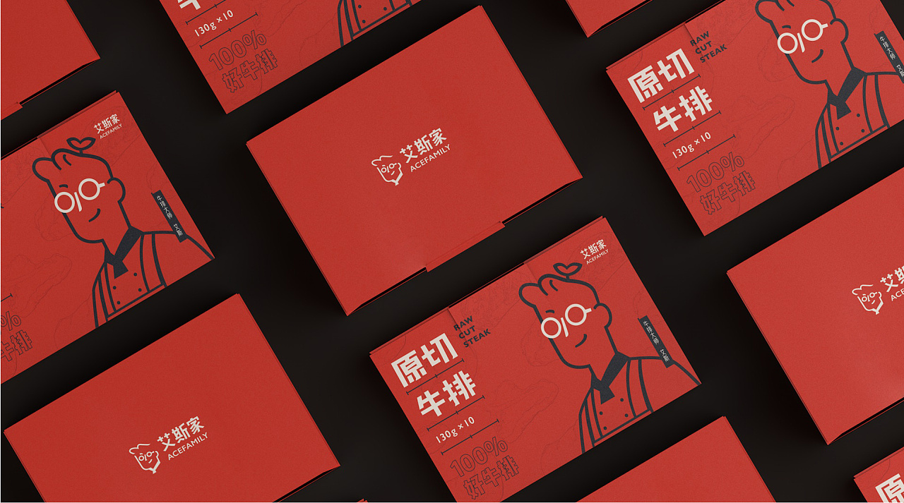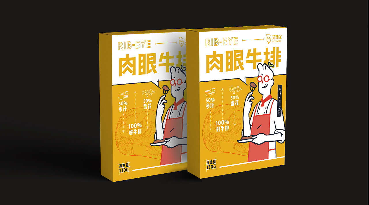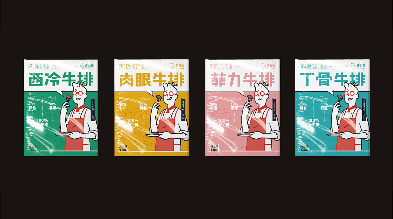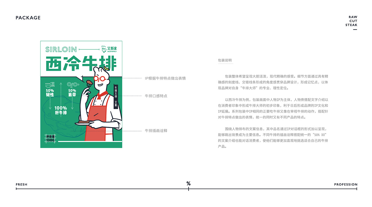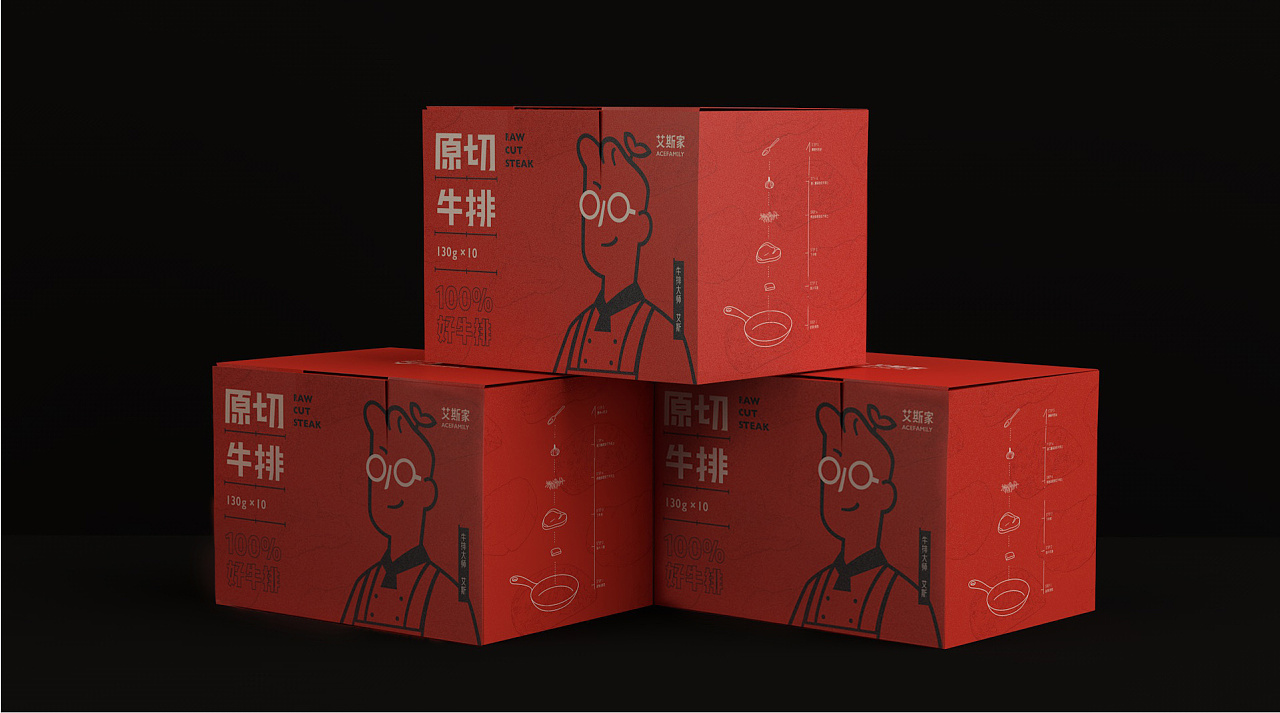 包装整体希望呈现大胆活泼,现代精确的感觉。细节方面通过具有精确的刻度线、交错线条形成的角度感贯穿品牌设计,形成记忆点,以体现品牌对自身“牛排大师”的专业、理性定位。