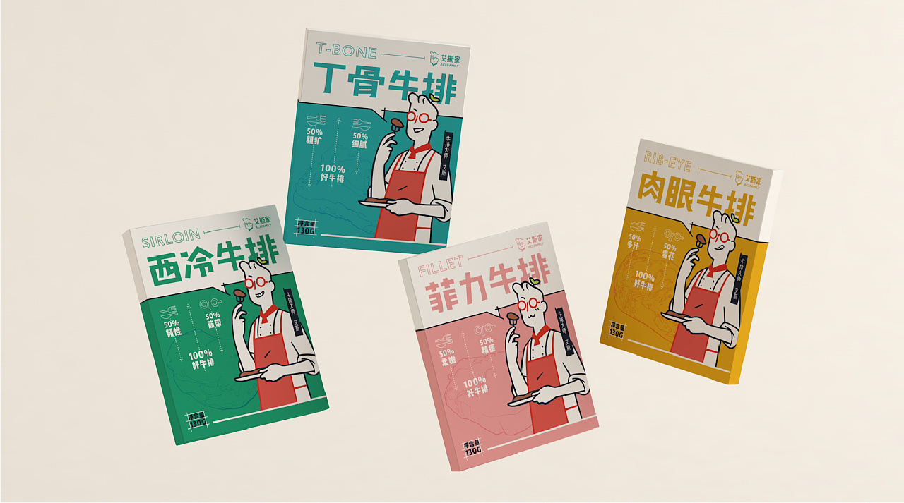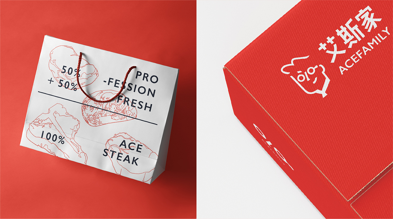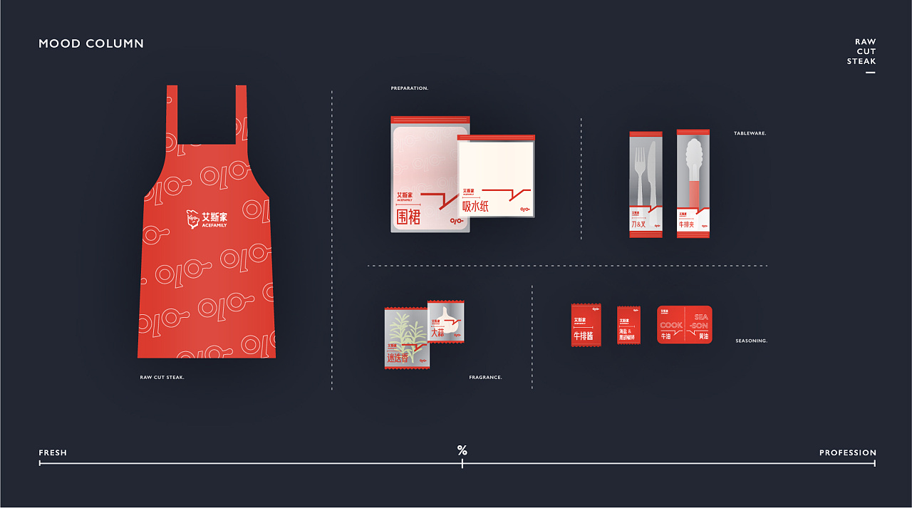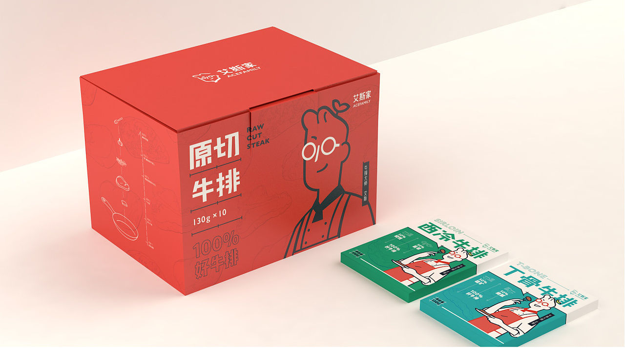 包装整体希望呈现大胆活泼,现代精确的感觉。细节方面通过具有精确的刻度线、交错线条形成的角度感贯穿品牌设计,形成记忆点,以体现品牌对自身“牛排大师”的专业、理性定位。