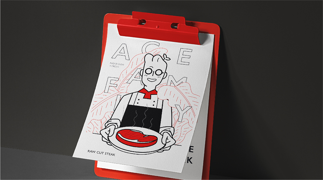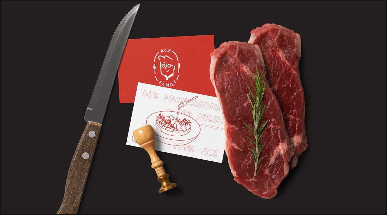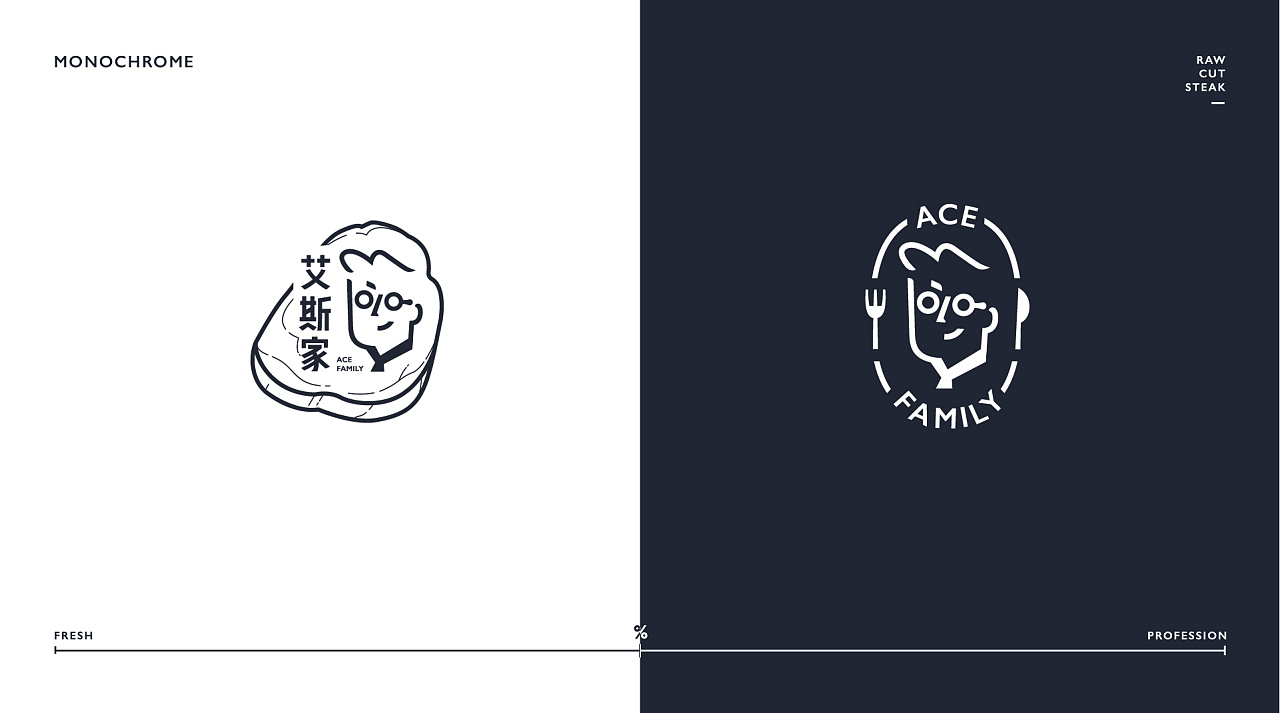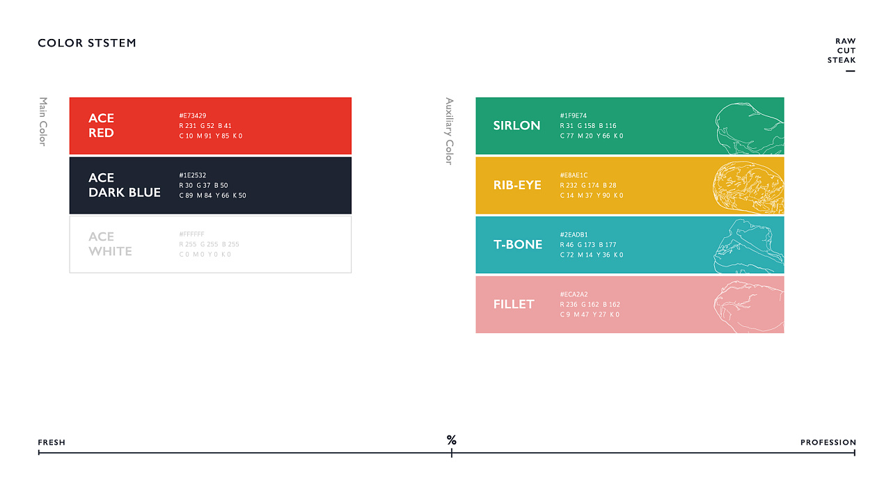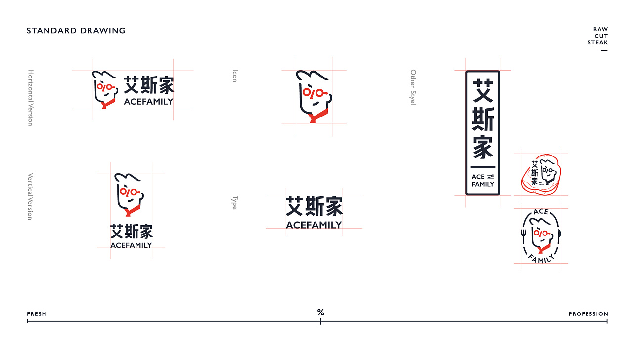 包装整体希望呈现大胆活泼,现代精确的感觉。细节方面通过具有精确的刻度线、交错线条形成的角度感贯穿品牌设计,形成记忆点,以体现品牌对自身“牛排大师”的专业、理性定位。
