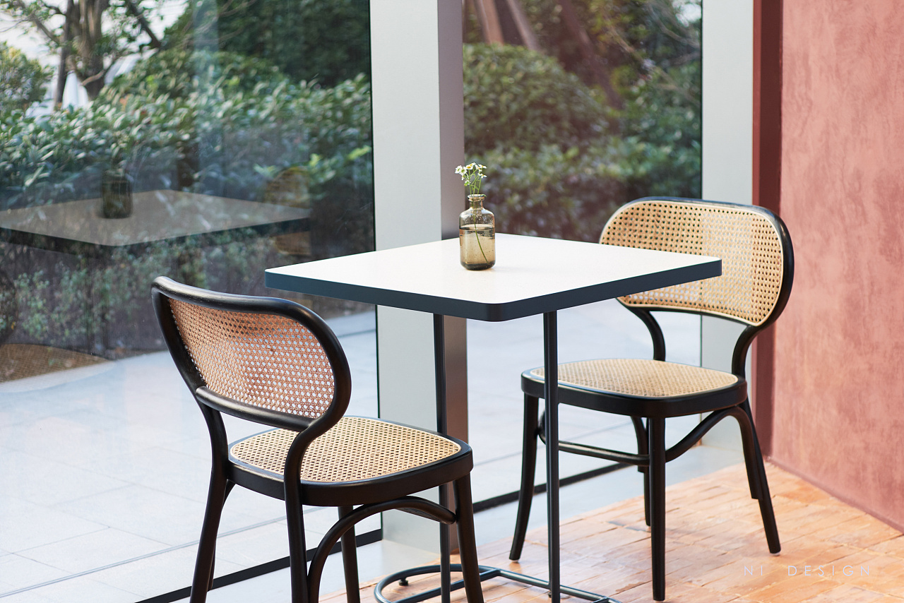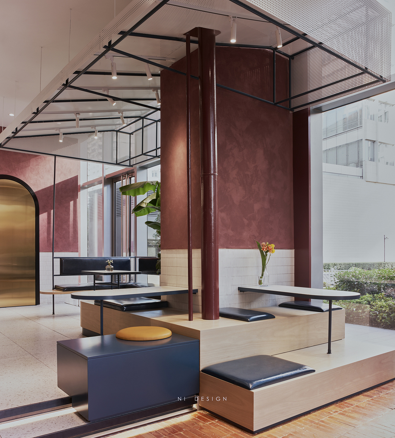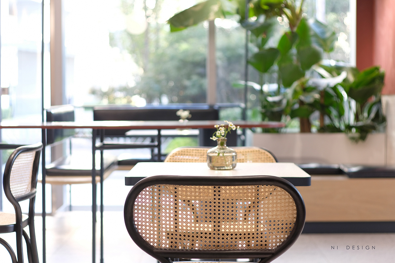靠近玻璃幕墙的区域设置为卡座区域,在轻盈的冲孔顶棚下,不规则的台阶和花盆堆砌在一起,更像是户外的花园卡座区。