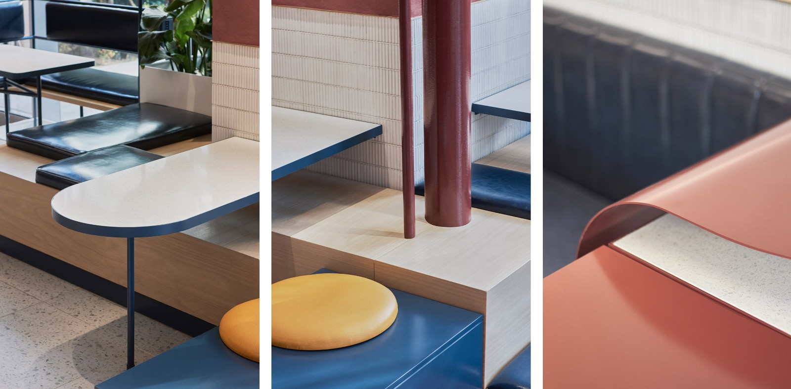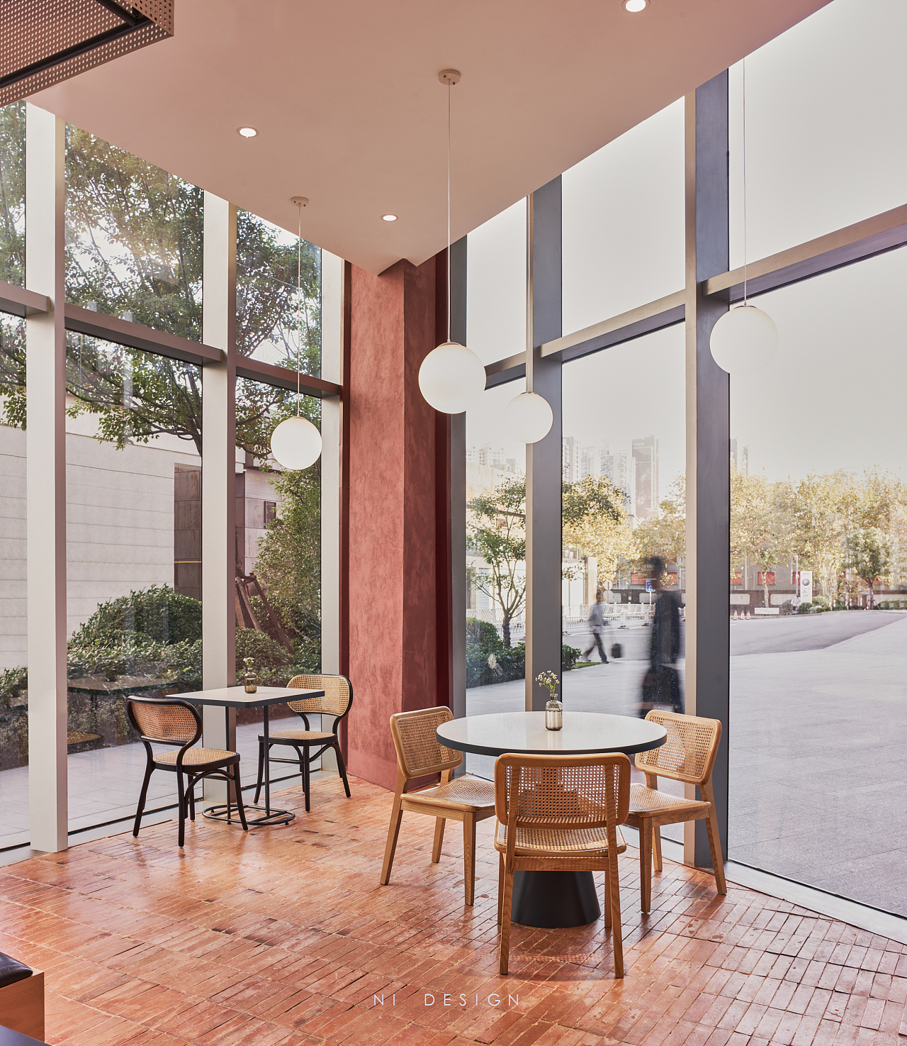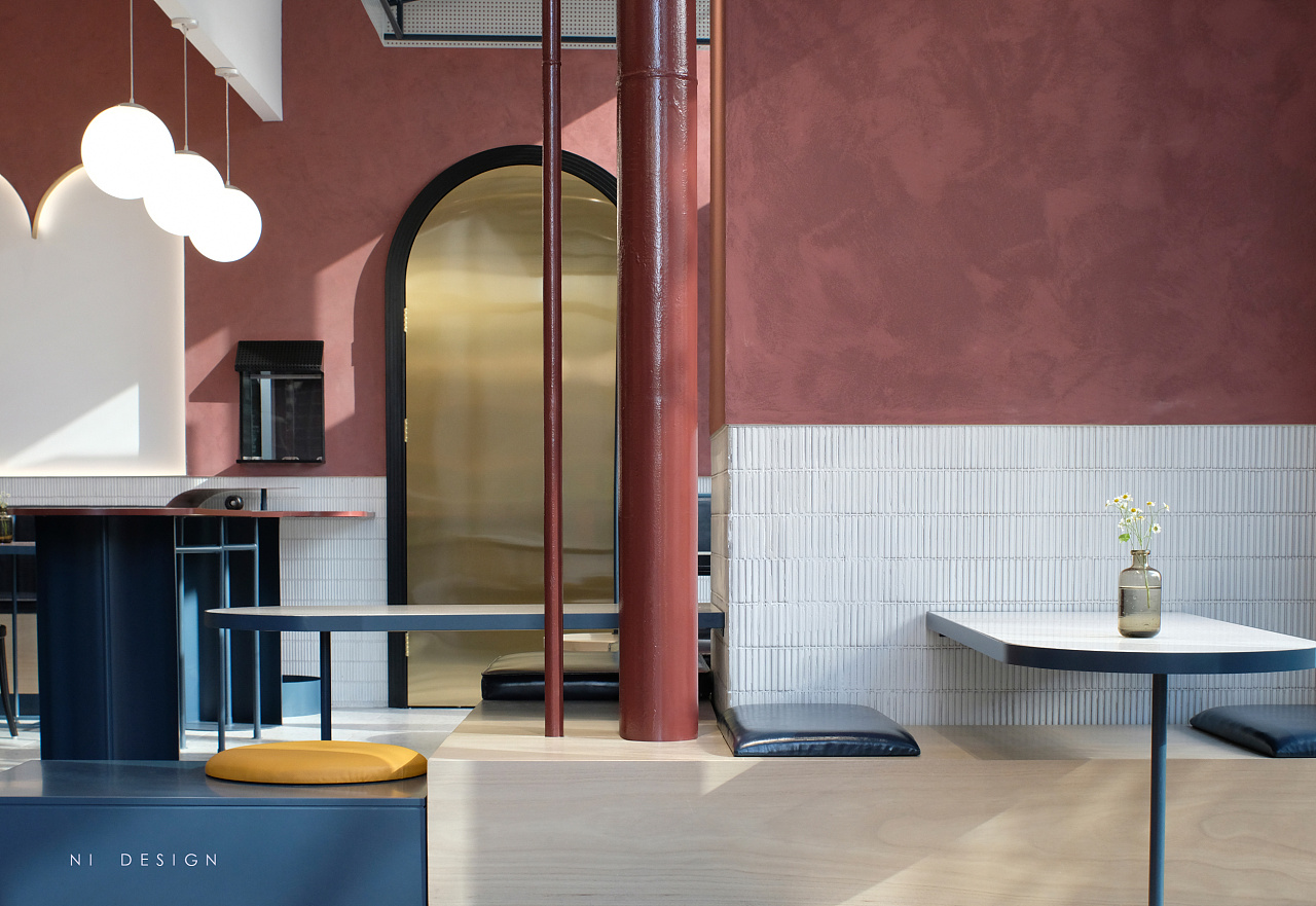 靠近玻璃幕墙的区域设置为卡座区域,在轻盈的冲孔顶棚下,不规则的台阶和花盆堆砌在一起,更像是户外的花园卡座区。