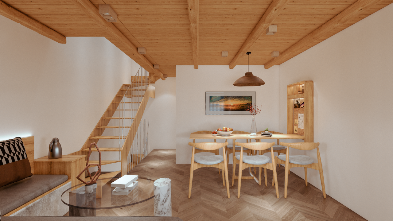 挑空设计增加了空间的通透感,让整个公寓显得更加宽敞。每个房间都有明确的功能划分,既满足了家庭成员的日常需求,又保证了私密性。实现了多功能分区的同时又确保空气流通,保持室内环境的舒适度。