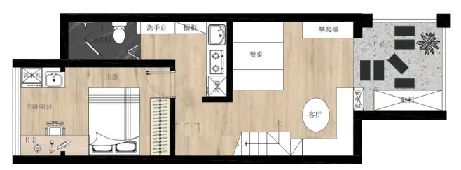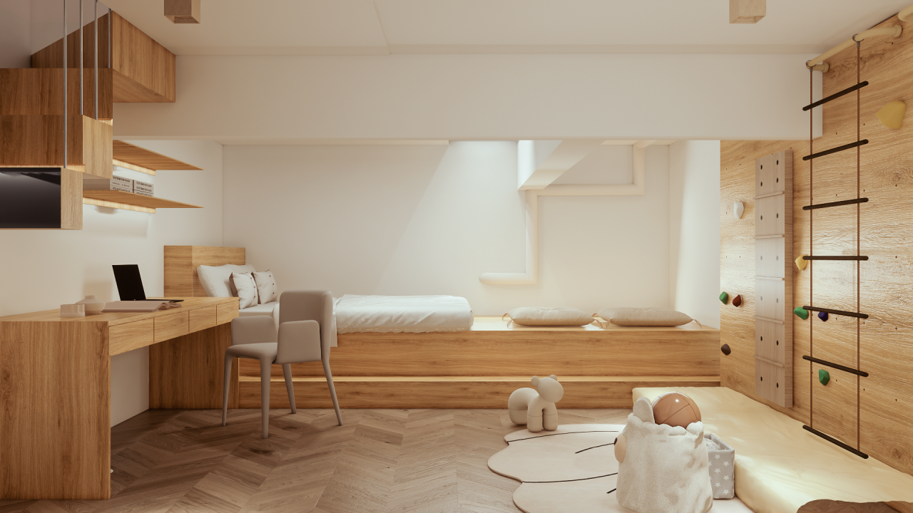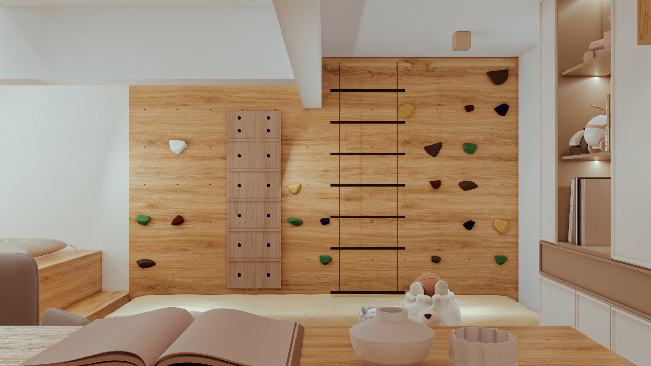 ●儿童房的攀岩墙和彩色的攀岩点增加了童趣和活力。书架和储物柜的设计简洁实用,提供了充足的收纳空间的同时兼顾了实用性和美观性。