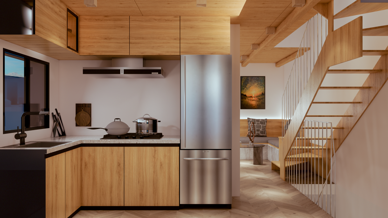 ●开放式的厨房设计使空间显得更通透,方便日常操作交流。木质橱柜的搭配时尚且实用,天花板和地板带来温暖的感觉,使整个空间显得更加舒适和宜人。