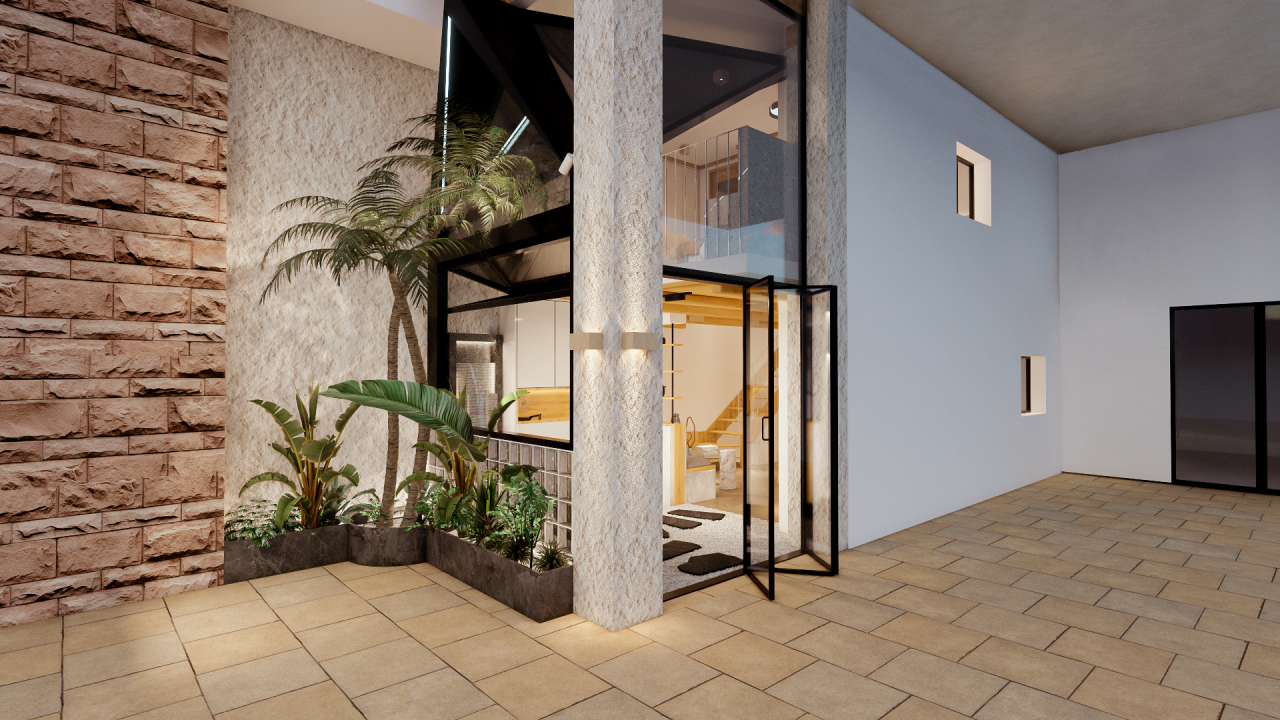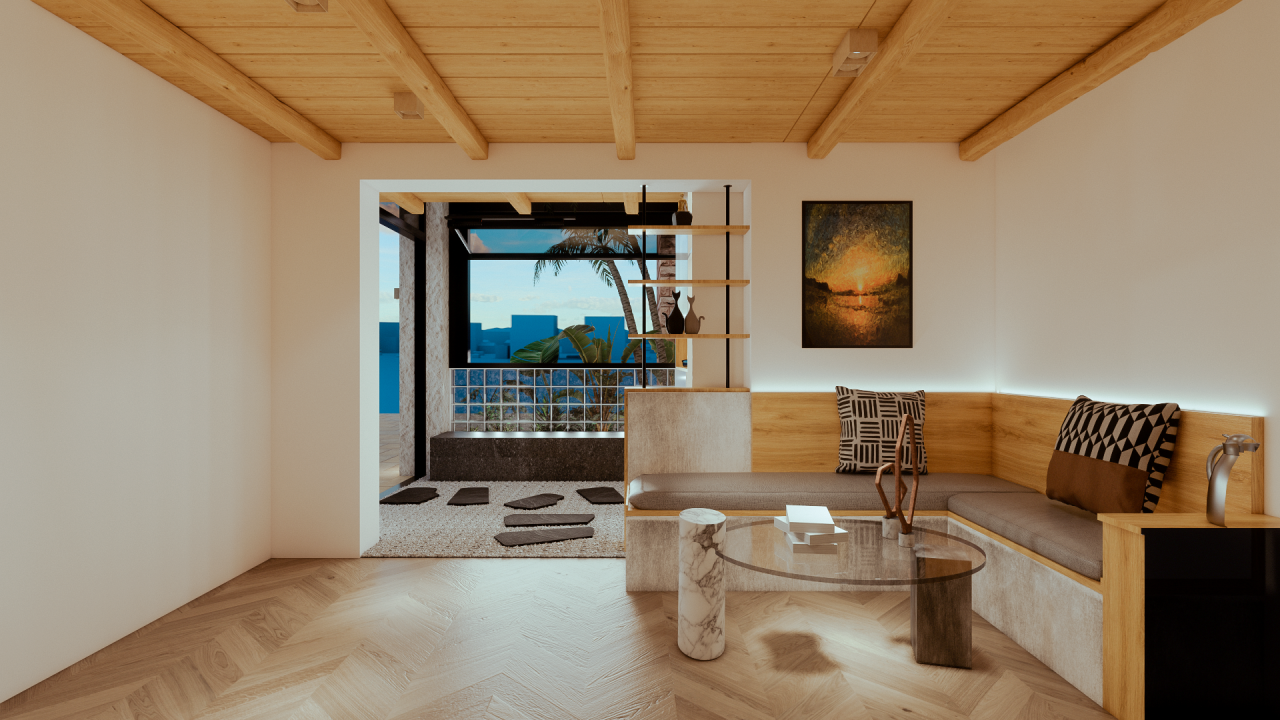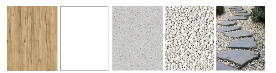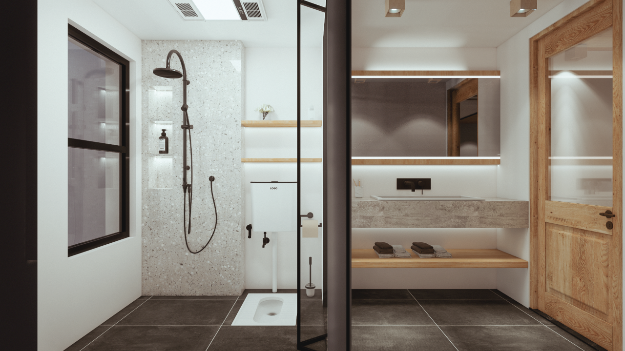 空间整体材质以橡木纹和白墙为主,温暖而清新、安静不失活泼,让空间充满温度与活力。水磨石和鹅卵石运用增添自然气息,而青石板则带来一丝静谧感,让空间既现代又充满生活气息。