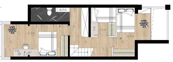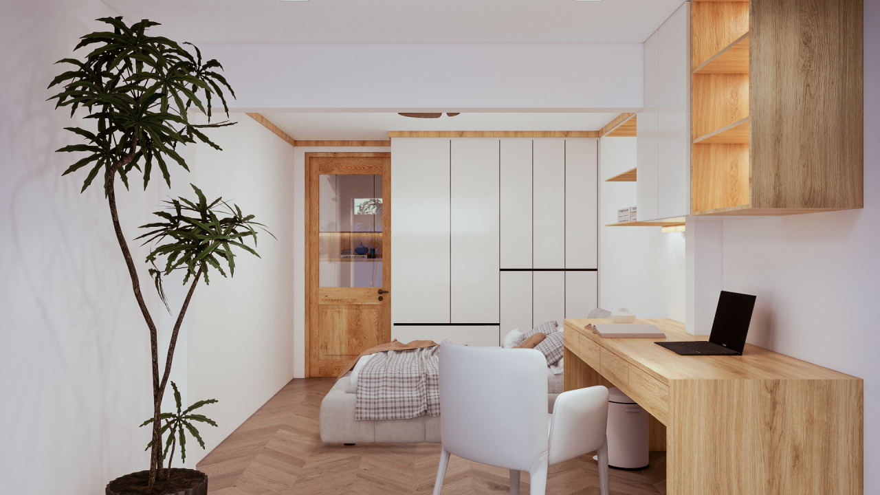 ●卧室整体色调柔和,搭配木质的暖色调营造温馨、舒适的氛围,让人感觉放松和自在。家具线条简洁、空间布局合理的同时,室内绿植的点缀也增加了自然气息,使空间更具活力。