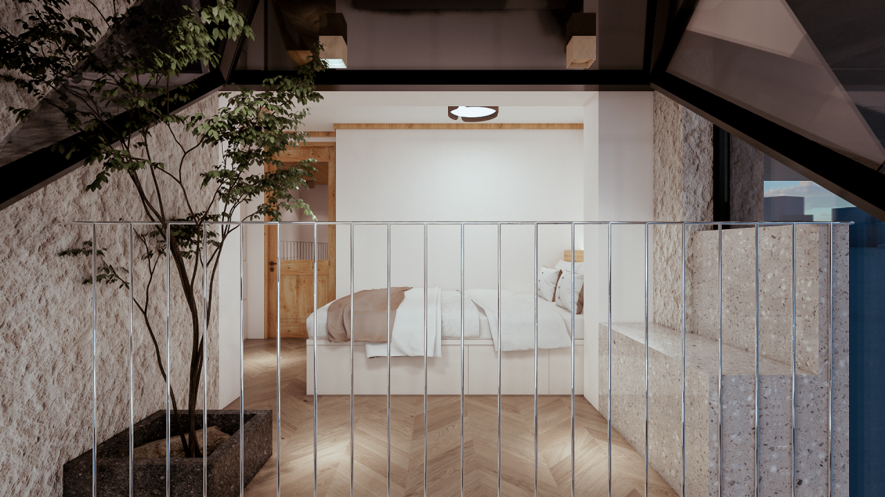 ●卧室设计温馨且具有自然气息,墙面和天花板采用暖色调,营造舒适的氛围。绿植的存在和半开放式的空间让人舒适。